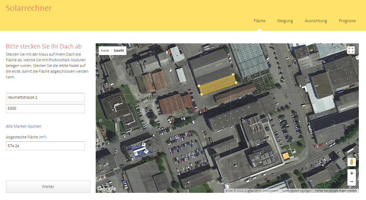 Solarstrom ist günstiger als Strom aus der Steckdose! Lohnt es sich auch auf ihrem Dach eine Photovoltaik-Anlage zu erstellen? Prüfen Sie selbst! Mit unserem Solarrechner können Sie abschätzen, wie viel Leistung (kwp) auf ihrem Dach platz finden und wie viel Strom sie Jährlich damit erzeugen können. Eine Kostenschätzung unter Berücksichtigung der Einmalvergütung (EIV) für Anlagen bis 30 kWp wird erstellt. Bei den Angaben handelt es sich um Abschätzungen. Fragen Sie uns für konkrete Offerten an. mehr