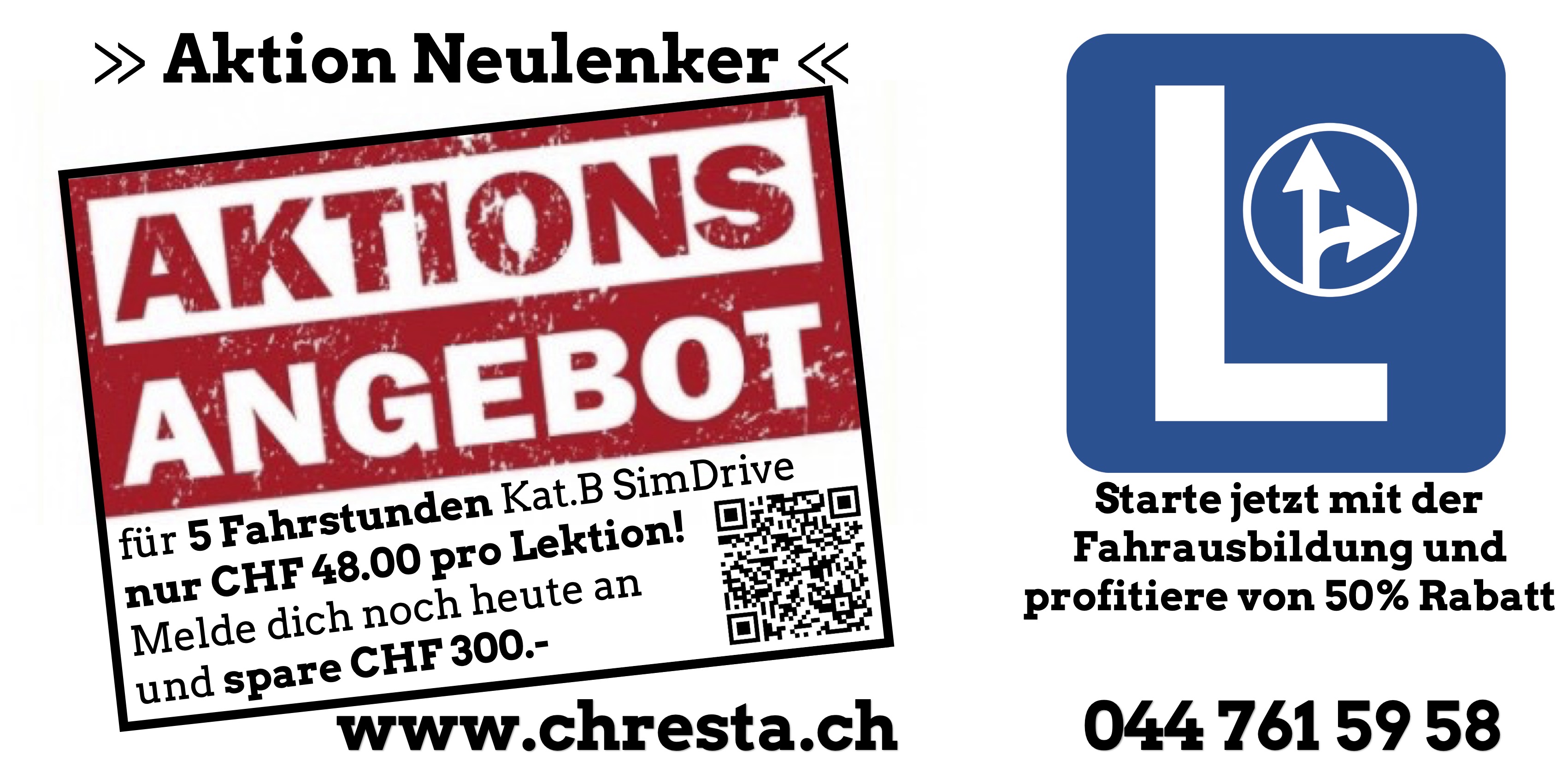 5 Fahrstunden nur 48.-/Lektion für Auto-Neulenker! Starte jetzt mit der Fahrausbildung und profitiere von 50% Rabatt auf die Fahrlektionen Melde dich noch heute an und spare CHF 300.- https://chresta.ch/shop/fahrschule/pakete/abos/gutscheine