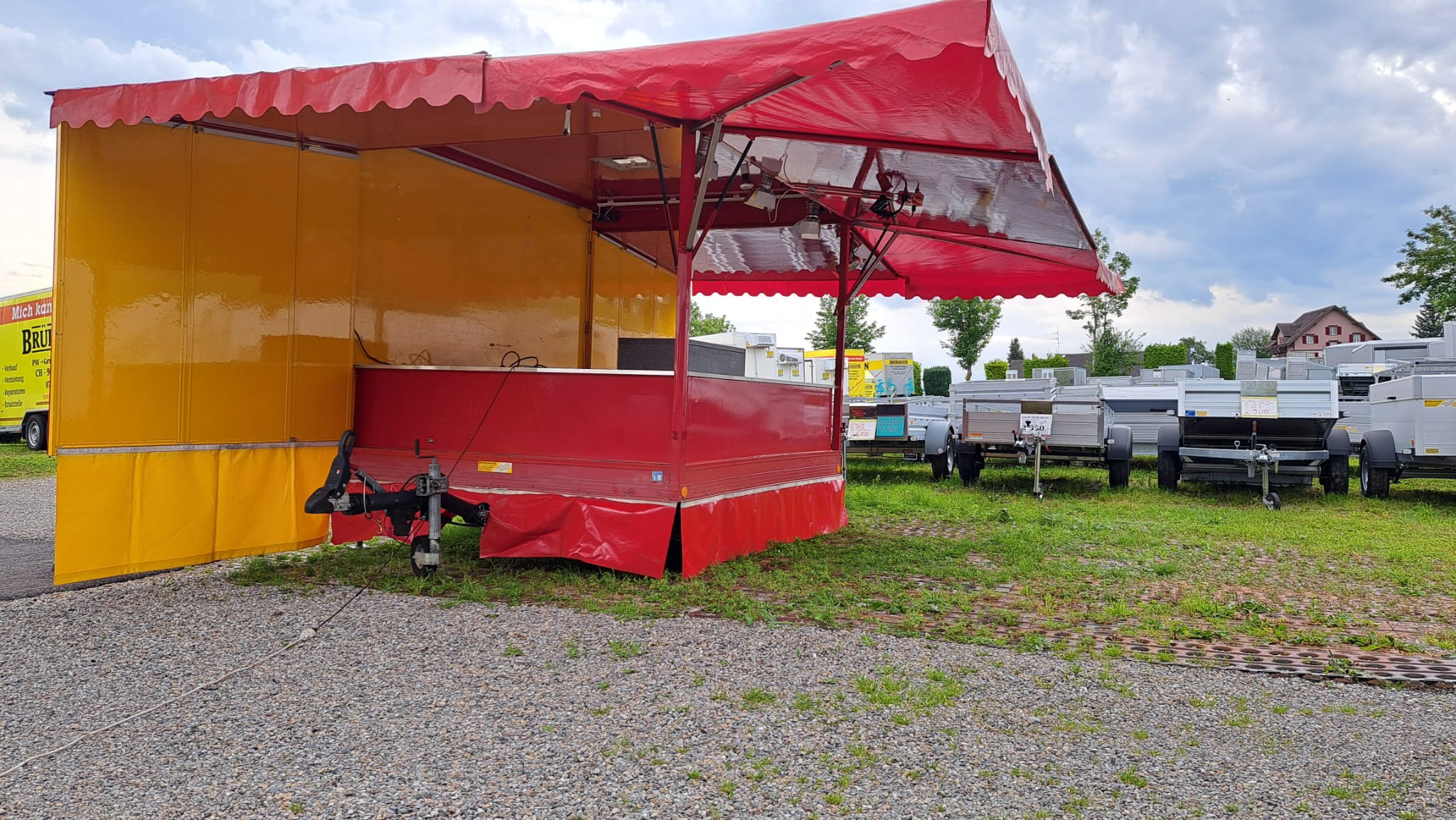 Gesamtgewicht: 1600 kg Leergewicht ca.:1200 kg Innenmasse: lxbxh: 288 x 237 x 222 cm einachser, Räder eingebaut mit Radkästen Auflaufbremse mit Rückfahrautomatik Stützrad, Anti Schlinger Kugelkupplung, Rohrdeichsel wegnehmbar Verkaufsanhänger mit Sandwichaufbau Seitenklappe links Klappe Vorne und Hinten, hinten integrierte Türe zwischen den Klappen Plane Verkaufs / Präsentations Theke re / li / vo , li erhöhtes Podest Faltwände zum Verkaufs- Rückwand hi/ vo verlängern überall Wind und Sichtschütze unten am Anhänger Dachfenster + div. Kleinigkeiten 4 Stützen JG 4.2003 ab Platz