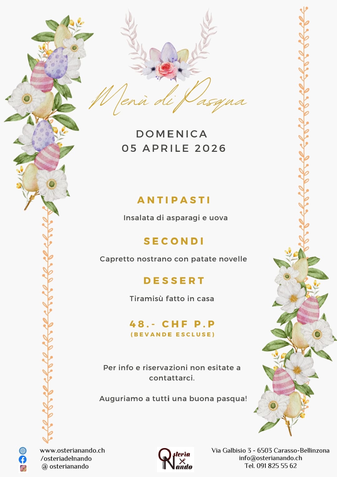 PRENOTAZIONI APERTE, chiamaci allo 091 825 55 62Menù di Pasqua DOMENICA 05 APRILE 2026 ANTIPASTI Insalata di asparagi e uova SECONDI Capretto nostrano con patate novelle DESSERT Tiramisù fatto in casa 48.- CHF P.P(bevande escluse) Per info e riservazioni non esitate a contattarci. Auguriamo a tutti una buona pasqua!