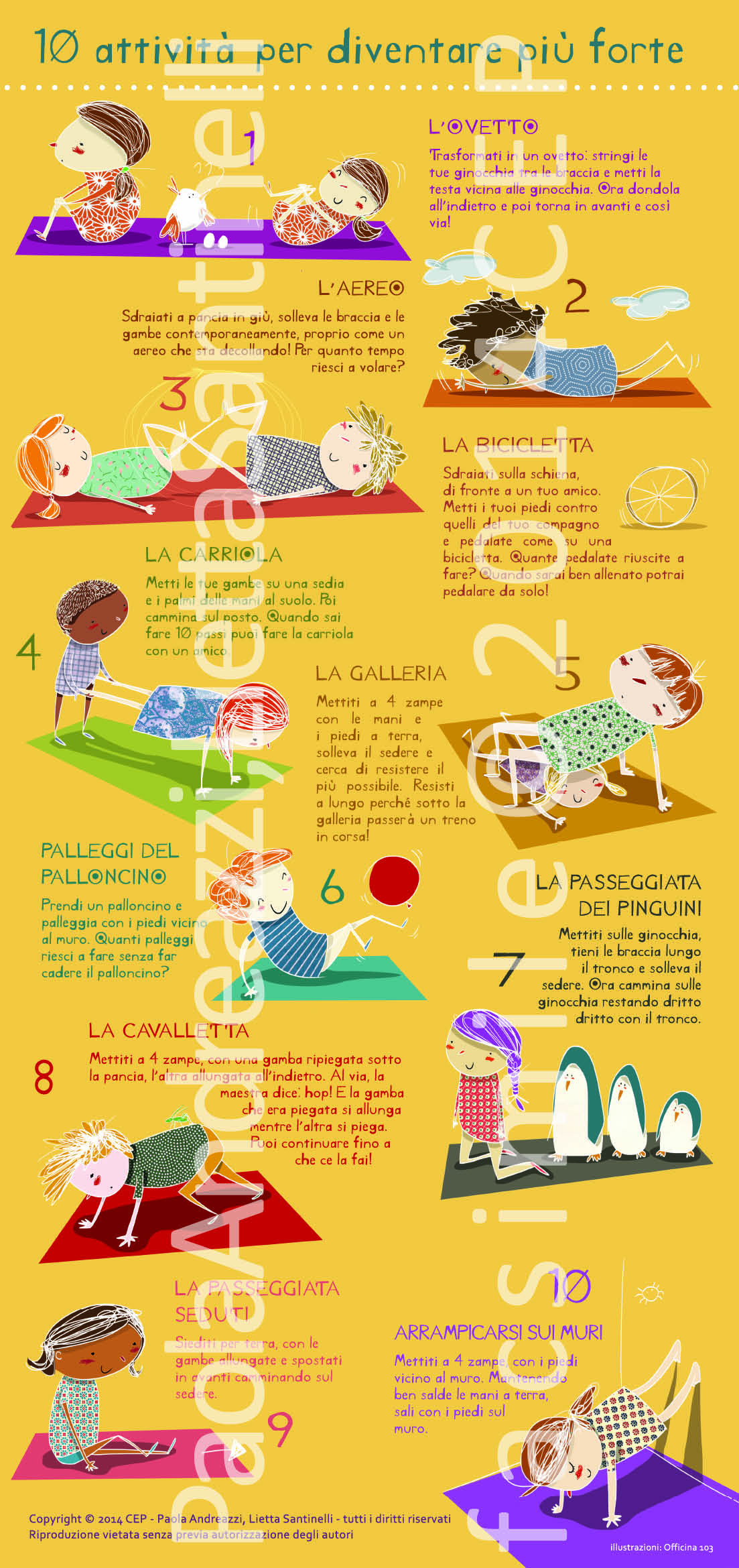 "10 activités pour devenir plus fort" et "10 activités pour retrouver le calme" Ergothérapeutes en pédiatrie depuis de nombreuses années, nous nous sommes basées sur nos connaissances cliniques et sur la littérature spécialisée pour créer ces recueils d’activités motrices. Ces posters sont nés pour répondre aux besoins de nos partenaires : enseignants, éducateurs, pédiatres, parents, concernés par la promotion du mouvement, de la santé et de l’apprentissage des enfants. Les activités illustrées dans le poster « 10 activités pour devenir plus fort » sont des activités qui permettent de développer de manière ludique les habiletés utiles aux apprentissages et à l’autonomie, en particuliers le contrôle postural. Le contrôle postural est important pour le développement de l’équilibre et de la coordination motrice, mais aussi pour le maintien de la posture assise, le développement de la latéralisation et de la motricité fine, qui sont nécessaire à l’écriture, au découpage, mais aussi à l’habillage et à la socialisation. Les activités illustrées dans le poster « 10 activités pour retrouver le calme » sont des activités motrices qui stimulent le système tactilo-proprioceptif afin de calmer l’agitation motrice et de favoriser la capacité de focaliser son attention sur des tâches tranquilles. Les activités peuvent être proposées aux enfants dans des moments d’excitation pour amener le groupe à retrouver le calme, ou enseignées à des enfants en particulier pour stimuler l’autorégulation. En réalisant ces posters, nous tenons à contribuer à la promotion de la santé et du bien-être de l’enfant par le mouvement, car nous sommes persuadées que l’investissement de temps correspondra à un véritable gain pour la vie de l’enfant, mais aussi pour la communauté entière. Pour en savoir plus: www.ergoterapiapediatrica.ch