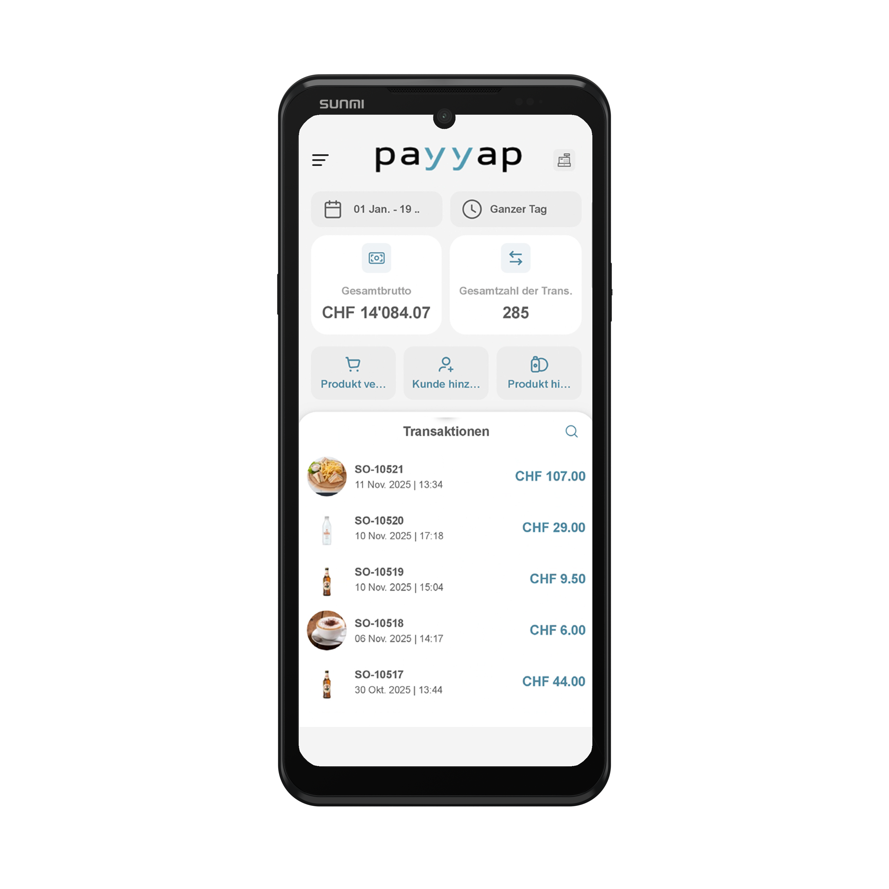Mobiles Terminal + payyap Kasse + Tap on Mobile + BondruckerAlles für einmalige CHF 389.- ohne monatliche Kosten! Hier geht's zum Produkt: https://www.payyap.ch/produkte/sunmi-v3 Mobiles Android-POS-Terminal mit integriertem Thermodrucker – ideal für schnelles, flexibles Einkassieren mit payyap inklusive Tap-on-Mobile Payment via Worldline. Unterstützt Tap on Mobile und benötigt kein zusätzliches Kartenterminal - 6.75" Touchdisplay - Octa-Core CPU - 4GB RAM - 64GB ROM - 58mm Thermodrucker - WiFi, Bluetooth, GPS,NFC - Gewicht: 419g - Grösse: 238mm x 81.8mm x 16.8mm - Garantie: 12 Monate All-in-one-POS-Lösung für modernes Einkassieren Das SUNMI V3 mit payyap vereint Android-Power, integrierten Bondrucker und mobiles Bezahlen in einem kompakten Gerät – perfekt für Gastronomie, Retail oder Events. Kontaktlose Zahlungen direkt am Gerät Mit payyap integrierter Tap on Mobile-Lösung und dem Payment via Worldline (SoftPOS), akzeptieren Sie kontaktlose NFC-Zahlungen direkt über das Terminal – ohne zusätzlichen Kartenleser.