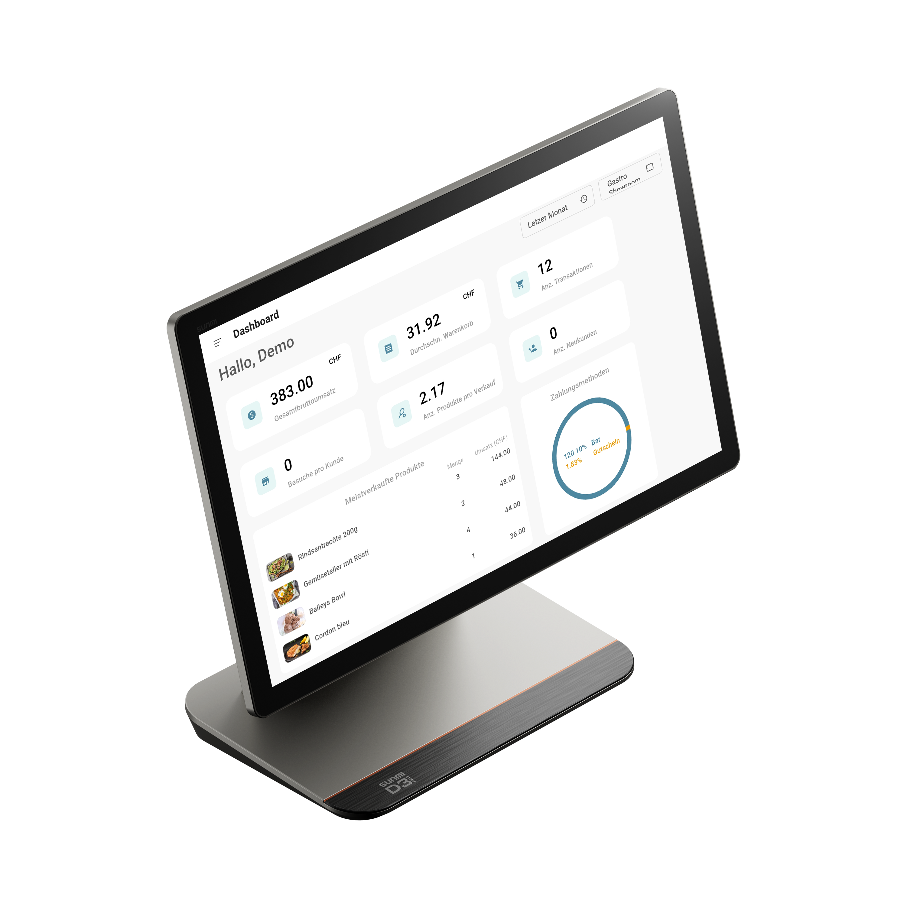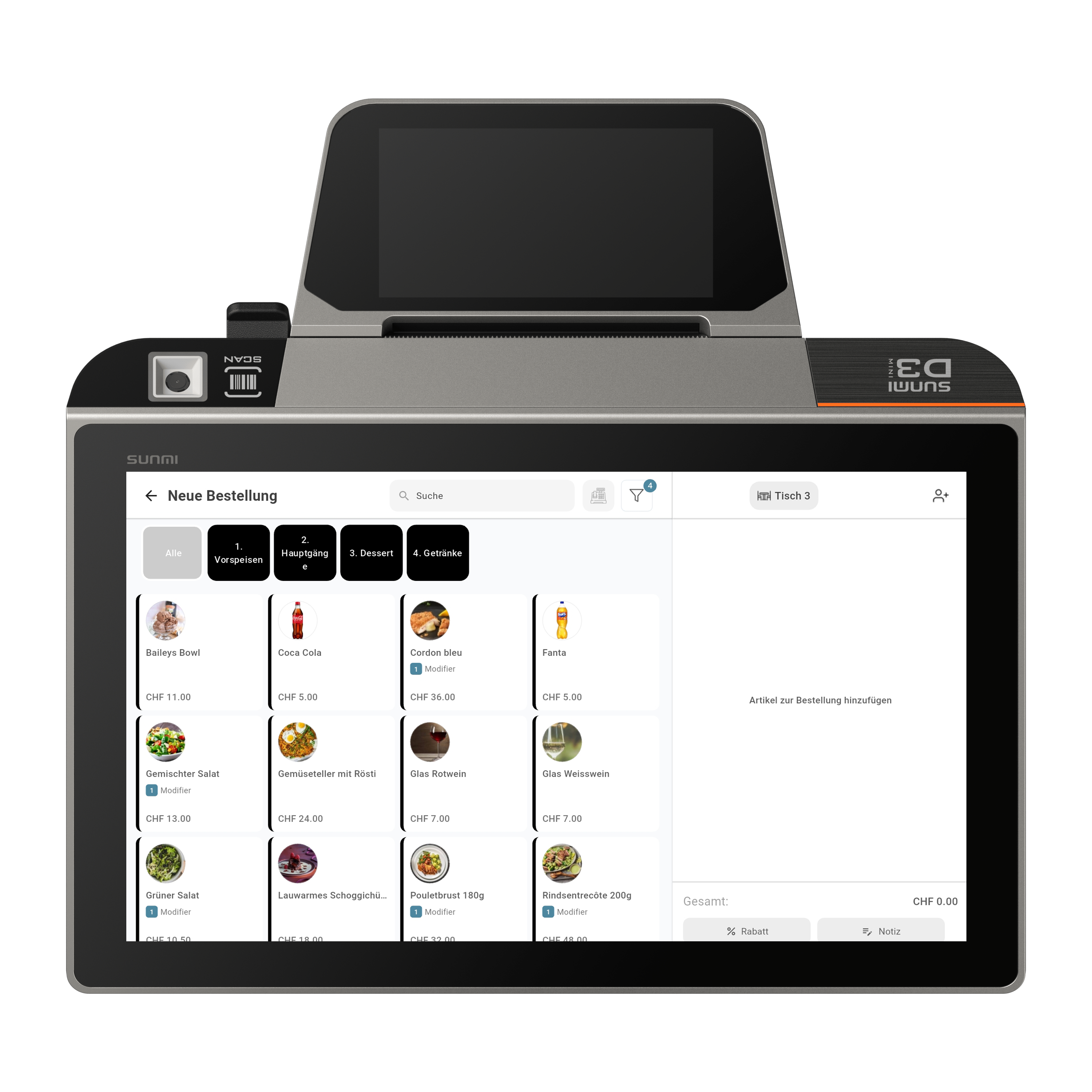Stationäre Kasse + payyap Kasse + Tap on Mobile PaymentAlles für einmalige CHF 834.- ohne monatliche Kosten! Hier geht's zum Produkt: https://www.payyap.ch/produkte/sunmi-d3-pro-mit-payyap Leistungsstarkes Android Desktop Kasse mit grossem 15,6″-Touchdisplay – die Premium-Lösung für effizientes Kassieren, Bestell- und Zahlungsmanagement mit payyap und Tap on Mobile Payment via Worldline. Unterstützt Tap on Mobile und benötigt kein zusätzliches Kartenterminal - 15.6" Touchdisplay - Qualcomm Hexa-Core CPU - 4GB RAM - 64GB ROM - LAN, WiFi, Bluetooth, GPS,NFC - Kundendisplay mit NFC Kartenleser - Gewicht: 3.1kg - Garantie: 12 Monate Kartenzahlungen & TWINT direkt an der Kasse Mit dem SUNMI D3 Pro wird Bezahlen besonders einfach: Karten und TWINT werden direkt über das Kassen-Display akzeptiert – ganz ohne separates Zahlungsterminal. Kund:innen halten ihre Karte oder ihr Smartphone einfach an den Bildschirm, und dank moderner SoftPOS-Technologie erfolgt die Zahlung schnell, sicher und komfortabel.