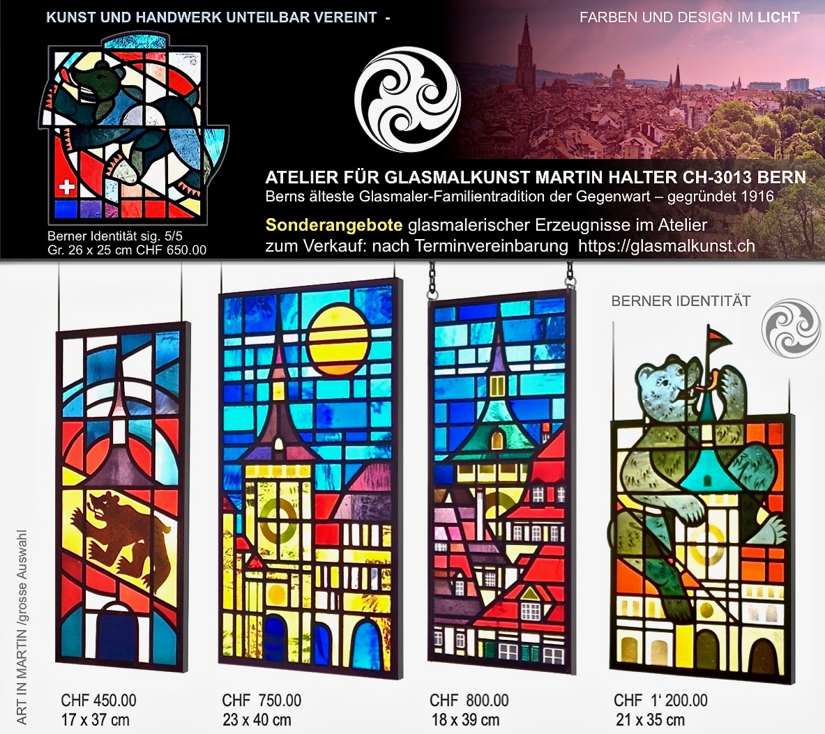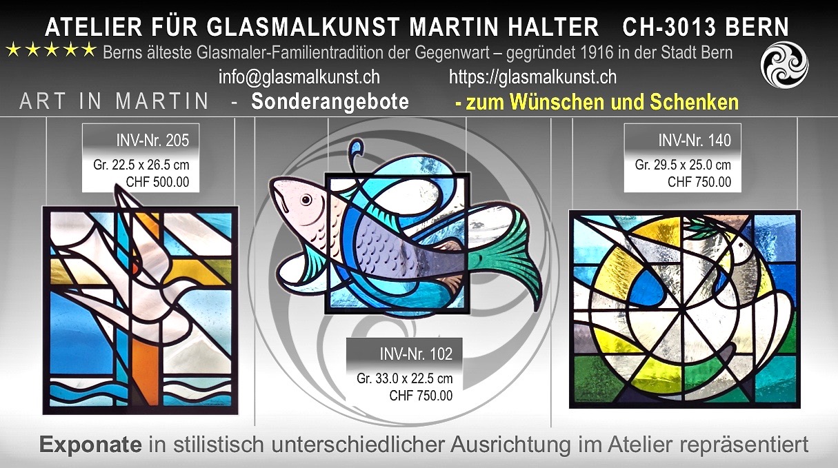 Berns älteste Glasmaler-Familientradition der Gegenwart - gegründet 1916 - repräsentiert auch Sonderangebote zum Verkauf. Martin Halter (3. Generation) erwartet Sie gerne zu einem Atelierbesuch, nach vorrangiger Terminvereinbarung: via Webseite Sie finden ebenso thematisch andere Sujets in glasmalerischer Ausführung zu Sonderangeboten repräsentiert. Lassen Sie sich überraschen > hier repräsentiert sich Kunst und Handwerk unteilbar vereint. Dieses Atelier befindet sich seit 1923 an demselben Standort in der Berner Unterstadt direkt an der Aare - Klösterliareal.