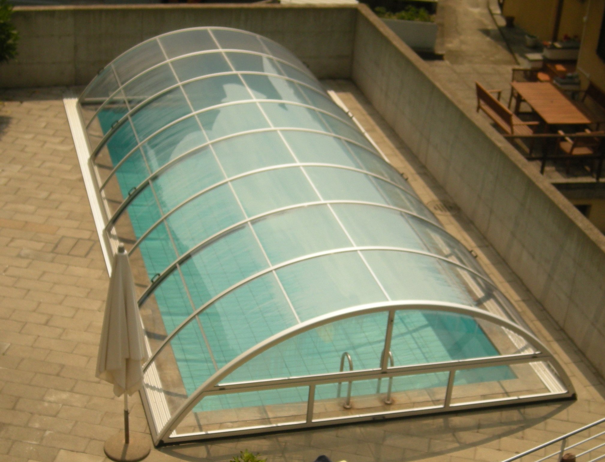 Copertura telescopica varie esecuzioni con binari e telaio in alluminio, vetrate in policarbonato alveolare o massiccio