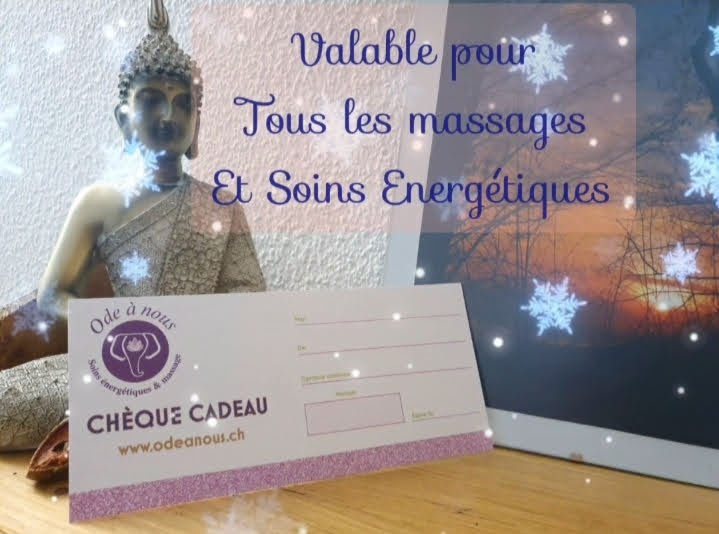 Offrez un cadeau pour chaque occasion de la vie : Anniversaire, Noël, remerciements, pensée chaleureuse Avec: - Les bons cadeaux à choix pour une pliusieurs durée de soins : - 45 min, 1h, 1h30 Valables pour tous les soins énergétiques et massages ! Commandez maintenant directement en ligne ! Envoi gratuit en Suisse Paiement par Twint, cash ou virement bancaire