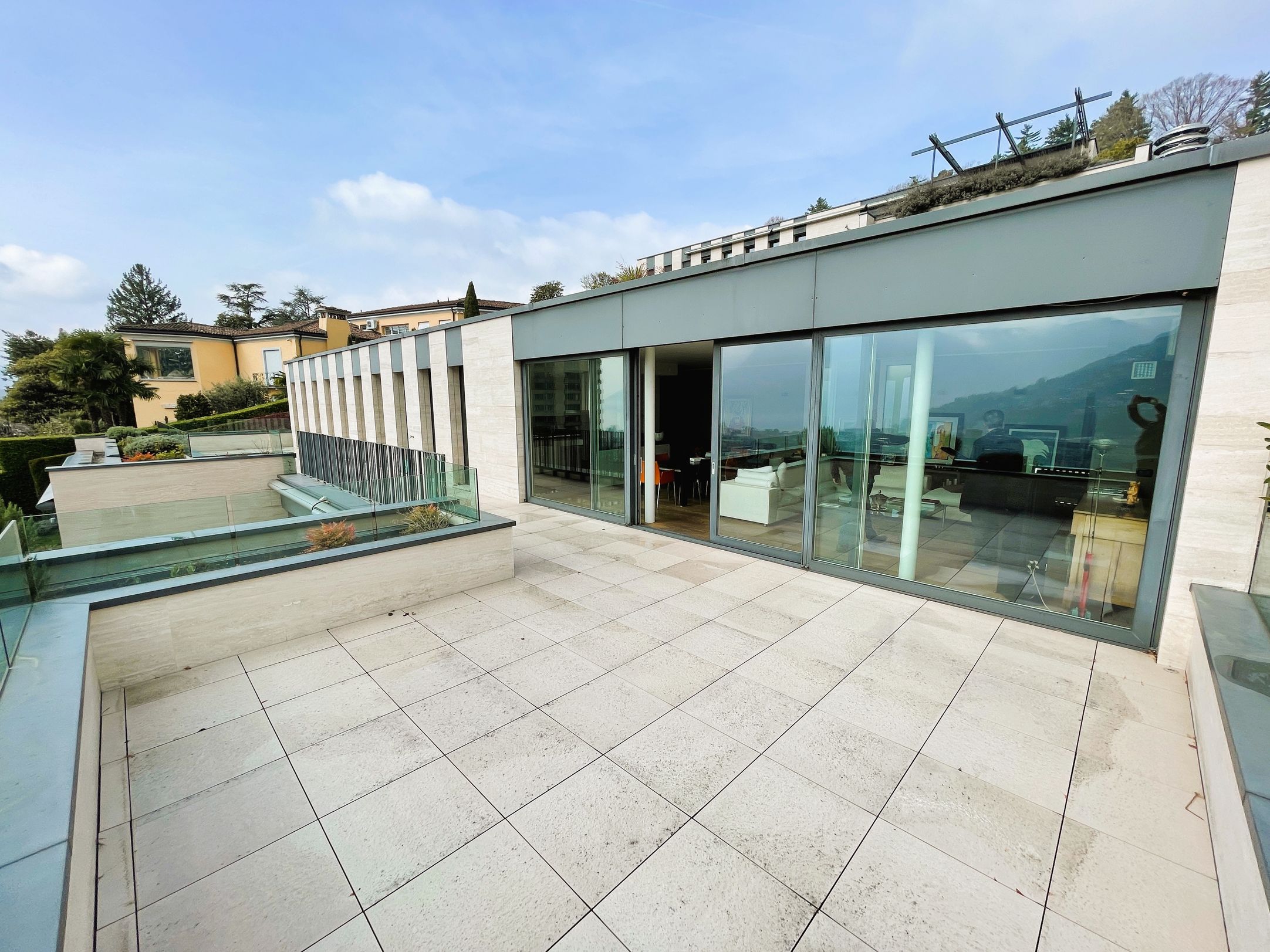 Rif. D2222-A4 - Sup. 195 mq - 4 locali - 3 camere - 2 bagni A Lugano, in un contesto residenziale collinare molto tranquillo e soleggiato vendiamo ATTICO SIGNORILE di 4,5 locali e ca. 160 mq SUL + 70 mq di terrazza panoramica con splendida vista sul LAGO, la CITTÀ e le montagne circostanti (superficie commerciale 195 mq inclusa metà terrazza senza le fioriere). La zona è molto silenziosa, dista pochi minuti dal centro cittadino ed è a breve distanza dalla fermata del bus. La residenza, costruita nel 2011, si compone di sole 6 unità abitative divise in 2 blocchi, garantendo un'ottima privacy. L'appartamento in vendita si trova al piano attico del secondo blocco e si presenta in ottimo stato. Vi si accede con entrata indipendente dall'esterno oppure internamente dall'autorimessa raggiungibile con monta-auto dalla strada superiore. Gli spazi sono così composti: atrio d'ingresso con armadi a muro, generoso soggiorno-pranzo con camino ed uscita sull'ampia terrazza, cucina tecnologica con isola a vista, servizio con doccia con bagno-turco, 2 camere, zona padronale con disimpegno e guardaroba, camera matrimoniale, bagno in marmo di Carrara Gold con vasca e doccia, doppio lavabo, bidet e finestra. Tutte le camere hanno accesso diretto alla terrazza. Lavanderia e cantina privata al piano inferiore. 2 Posteggi in autorimessa a Chf 60'000.- cadauno. L'abitazione è dotata di domotica ed impianto musicale, impianto d'allarme, aria condizionata, tapparelle elettriche. L'appartamento è ideale per chi cerca un contesto residenziale tranquillo vicino alla città. (Deutsch & English: immobiliare.mpp.ch).