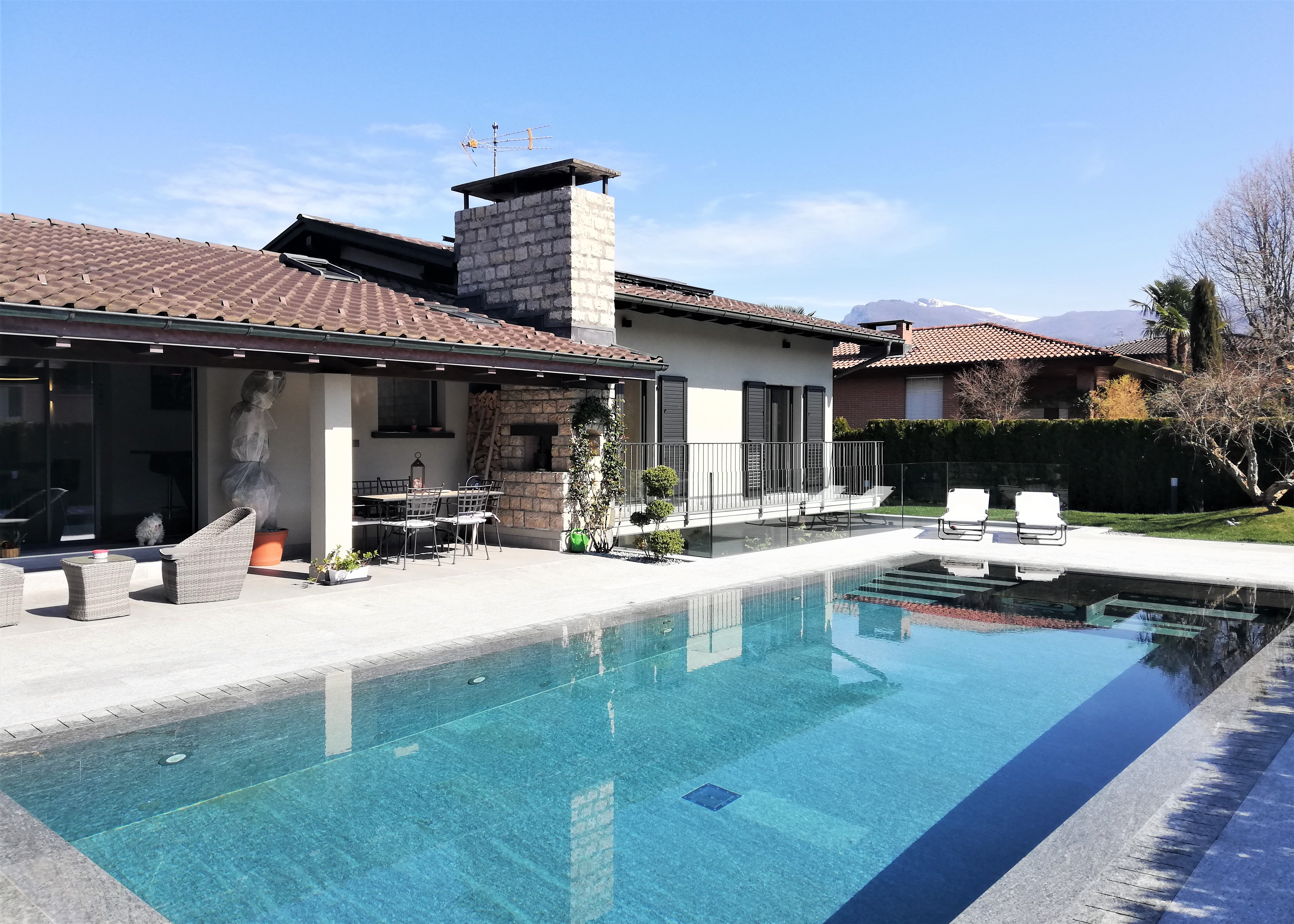 Rif. S2221 - Sup. 222 mq. - 5 locali - 3 camere - 3 bagni A Genestrerio, quartiere di Mendrisio, in zona residenziale tranquilla a traffico limitato, strategicamente comoda per raggiungere le principali arterie stradali in pochi minuti, vendiamo ESCLUSIVA VILLA con giardino e piscina, completamente ristrutturata con materiali di alto standing nel 2018. Anche come RESIDENZA SECONDARIA. La proprietà, completamente recintata, dispone di comodo accesso veicolare, garage per 2 auto con apertura automatica e piazzale per 6 posti auto. Internamente la casa presenta finiture e accessori di primissima qualità; gli spazi sono ben distribuiti e la parte abitativa principale si sviluppa su un unico livello, così composta: atrio guardaroba, bagno di servizio, zona giorno con camino, cucina con penisola e ampia zona pranzo. Zona notte con 3 camere da letto (2 con accesso al balcone), bagno con doccia multifunzioni, effetto cromoterapia con erogazione a cascata e bagno turco integrato. Il piano inferiore comprende una splendida taverna attrezzata con cucina, la cantina vini separata da un'elegante porta in vetro, bagno-doccia, ampia lavanderia, rifugio. Questo livello dispone anche di ingresso indipendente. Fiore all'occhiello della villa è la splendida piscina che domina il giardino: a sfioro, rivestita in pietra di Luserna con accessori di ultima generazione: nuoto controcorrente, seduta con idromassaggio lombare e plantare. Illuminata e riscaldabile. Tapparella di copertura gestibile tramite telecomando. Il giardino, che circonda la villa, dispone di irrigazione automatica per il prato e di sistema goccia a goccia per ogni pianta. Dalla zona giorno, tramite un'elegante porta scorrevole, si accede al portico di 15 mq con camino/grill integrato ed al giardino. Riscaldamento a termopompa con pannelli solari termici che consentono di riscaldare la casa, l'acqua e la piscina. Serpentine a pavimento. Impianto di decalcificazione dell'acqua sanitaria. (Deutsch & English: immobiliare.mpp.ch).