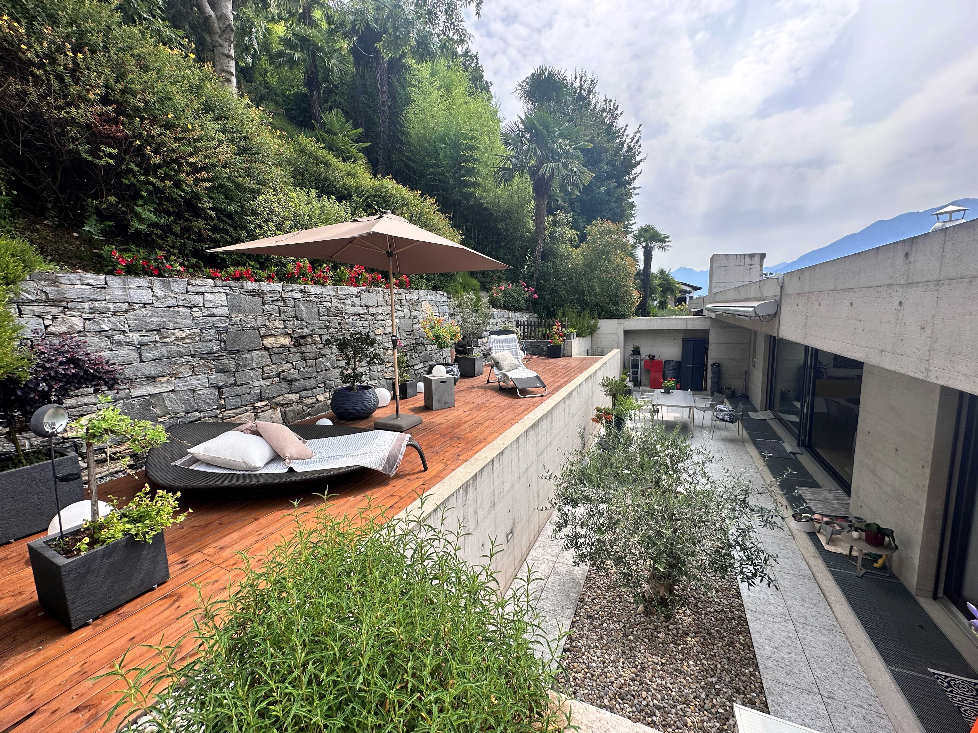 Rif. D2339-A9 - Sup. 220 mq - 4,5 locali - 3 camere - 2 bagni A Locarno, in una bella zona pregiata residenziale leggermente collinare vendiamomoderno e luminoso ATTICO 4,5 locali di alto standing con ampio balcone panoramico con vista sulla città e parzialmente LAGOe terrazza con solarium e giardino terrazzato. La zona è molto tranquilla e soleggiata vicino ai principali servizi, mezzi pubblici ed infrastrutture della città di Locarno e a soli 5 minuti da Ascona. La residenza, composta di sole 10 unità abitative, è di recente costruzione (2013-2014) e si sviluppa su 4 livelli oltre al piano terreno che comprende l'entrata alla residenza, i posteggi coperti e l'autorimessa. L'attico dispone di ampie vetrate che lo rendono molto luminoso, di finiture interne di pregio ed ha una superficie netta interna di ca. 145 mq + ca. 40 mq di balcone (lato anteriore) + ca. 40 mq terrazza/solarium + giardino terrazzato (lato posteriore). Gli spazi sono cosi ripartiti: atrio d'ingresso con ampio guardaroba (predisposizione per un servizio ospiti), spazioso soggiorno di oltre 55 mq con balcone da un lato e terrazza-solarium-giardino dall'altro lato, cucina moderna completamente accessoriata e con isola, zona notte composta da corridoio con guardaroba, 2 camere da letto servite da doccia-wc con finestra, zona padronale con disimpegno, ampio guardaroba, camera matrimoniale e bagno padronale con vasca, wc, doppio lavello e finestra. Da tutti i locali si accede al balcone panoramico anteriore e/o alla terrazza e giardino sul retro. L'appartamento dispone anche di un locale lavanderia. Completano la proprietà 1 cantina privata e 2 generosi posteggi (n° 3 e 4) in autorimessa a Chf 50'000.-/cadauno non inclusi nel prezzo. Serramenti in alluminio con doppi vetri, tapparelle e tende da sole elettriche, parquet pregiato, riscaldamento tramite termopompa con serpentine a pavimento. A breve è prevista inoltre l'installazione di pannelli fotovoltaici. Una proprietà elegante e raffinata per persone esigenti ! (Deutsch/english: immobiliare.mpp.ch).