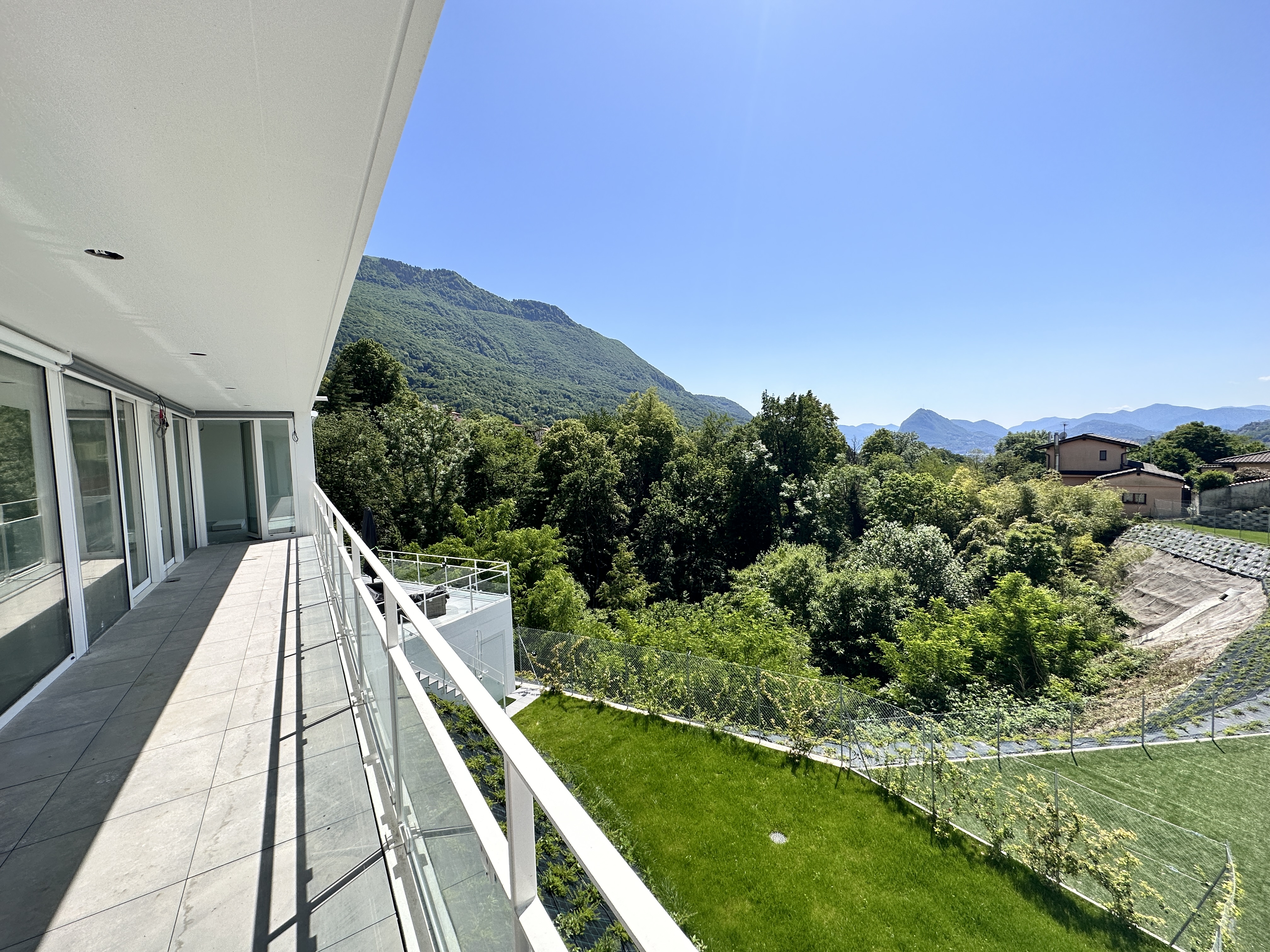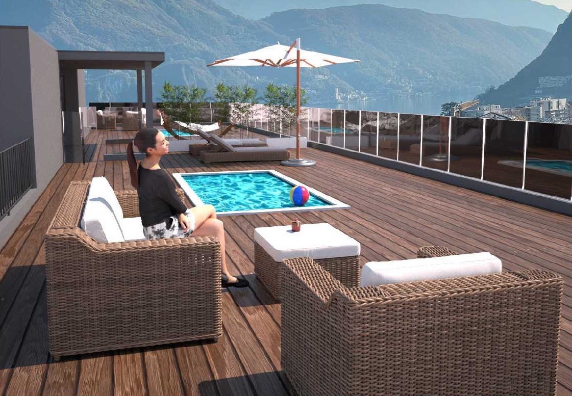Rif. D2326-D - Sup. 332 - 6,5 locali - 4 camere - 3 bagni In un quartiere vicino al lago del comune di Lugano, vendiamo moderna VILLA di alto standing, di 6,5 loc. con spettacolare VISTA LAGO, anche come RESIDENZA SECONDARIA, in nuova e pregiatissima residenza ad elevata efficienza energetica nZEB (nearly zero energy building), in una fantastica zona residenziale esposta a sud-ovest molto soleggiata e tranquilla, essendo ubicata in una strada secondaria, a ca. 100 m dal Lago di Lugano con spiaggia condominiale privata e a pochi minuti d'auto dai negozi e servizi, dall'entrata autostradale e ca. 10 minuti dal Centro di Lugano. La villa dispone di un accesso riservato e di un lift privato che conduce direttamente dall'autorimessa in casa; sovrasta le palazzine della residenza, offre viste mozzafiato ed un giardino con piscina privata che guardano il LAGO. Si sviluppa su 4 livelli dal 2° piano al 5° piano ed è così ripartita: 2° piano - zona hobby: ampia, che si presta a svariati usi; 3° piano - zona notte: ampio disimpegno-lift-scale, camera padronale con bagno en suite e SPA, 2 camere, bagno completo, lavanderia. 4° piano - zona giorno: lift-scale, ampio soggiorno-pranzo con camino e cucina americana, balcone, studio, bagno.Dal 3° e 4° livello si accede alla terrazza e al giardino privato con piscina. 5° piano - roof-top: ampio, con solarium, area living con barbecue, vasca idromassaggio. piano 0 - autorimessa: 4 posti auto in autorimessa ed eventuali ulteriori spazi disponibili. Ad esclusivo uso dei proprietari della residenza vi sono ulteriori servizi quali: piscina coperta riscaldata, spiaggia privata al lago (distante ca. 100 metri e facilmente raggiungibile a piedi), sala eventi equipaggiata con cucina per feste, palestra attrezzata, 2 veicoli elettrici in condivisione. La superficie commerciale della proprietà (calcolati i vari coefficienti %) è di ca. 332 mq, di cui: 209 mq area giorno + notte (3° e 4° piano); 100 mq roof-top (5° piano); 96 mq area hobby (2° piano), 350 mq giardino e piscina privati. Una proprietà esclusiva, in un contesto privilegiato, per un'elevata qualità di vita