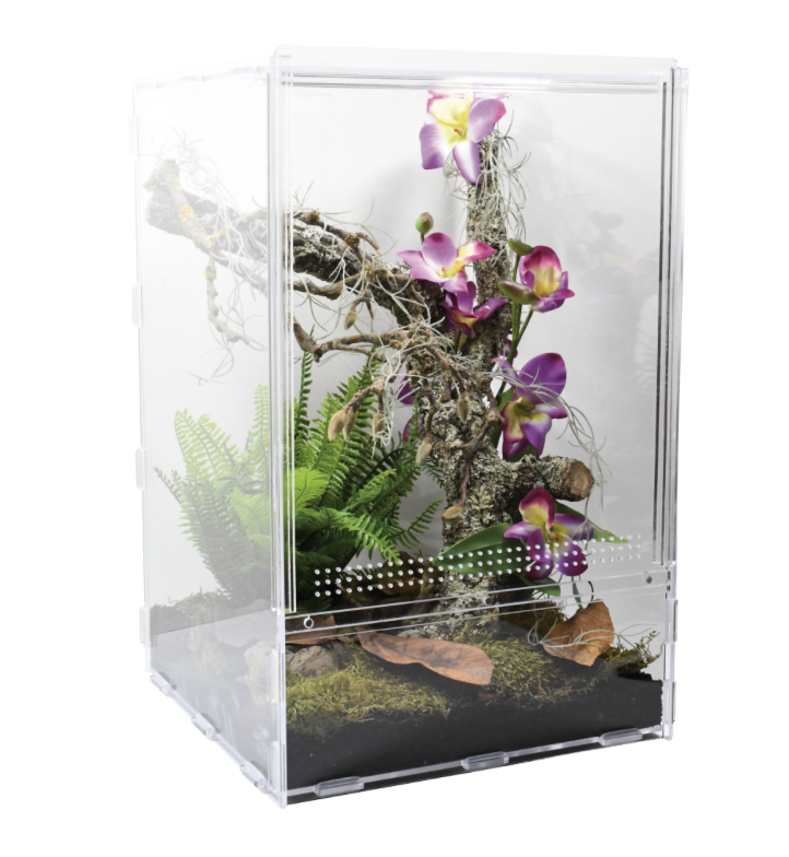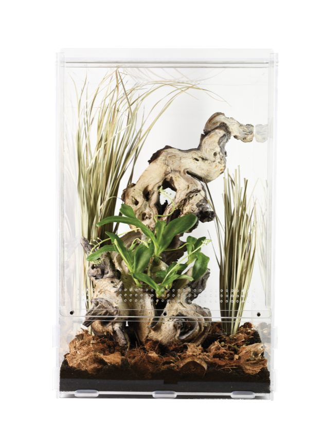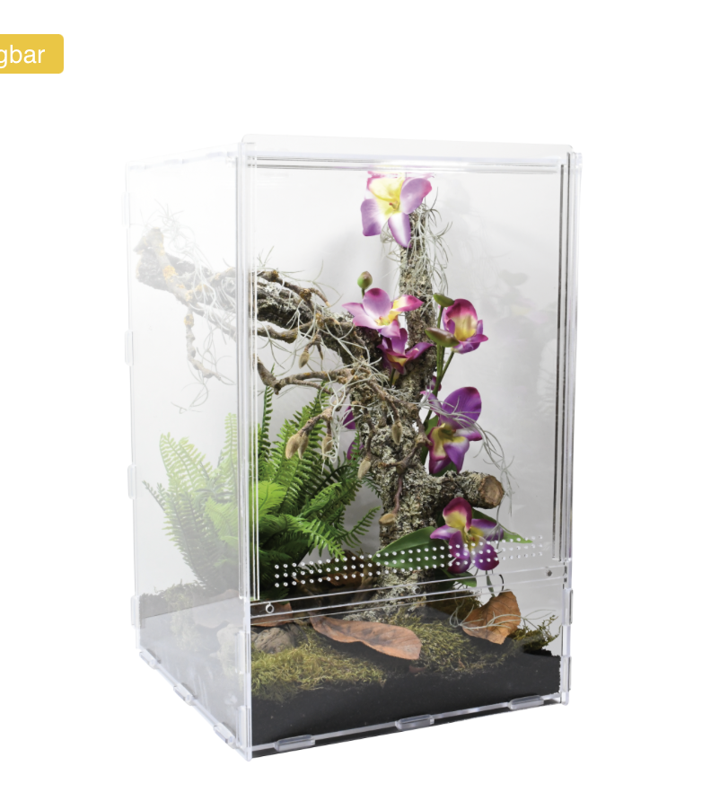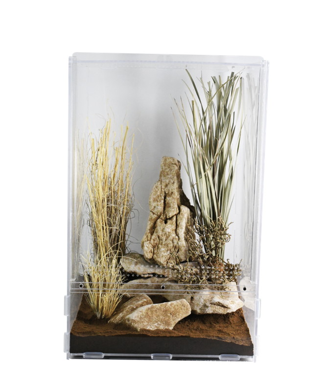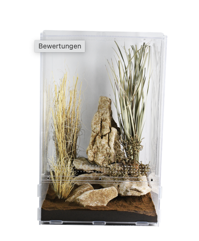 Produktinformationen "Lucky Reptile LifeTarrium" Durch die hochwertigen Acrylglas-Scheiben und das dezente Design, ist das Life Tarrium ein ganz besonderer Hingucker – egal ob im Wohnzimmer, oder auf dem Schreibtisch im Büro. Magnete an der Falltür bieten einen sicheren Verschluss, Luftlöcher in Frontsteg und Deckel sorgen für einen guten Luftaustausch und auch an ein einfaches Anbringen von Beleuchtung oder einer kleinen Heizmatte wurde gedacht. Die „USB Mini LED Lamp“ kann einfach an dem Steg der Rückwand befestigt werden, für lokal höhere Temperaturen, empfehlen wir die Lichteinheit „Life Light Halogen“, die neben Tag- und Nacht-LEDs einen Nano Halogenstrahler enthält. Jedem Life Tarrium liegt ein zweiter Deckel mit passendem Ausschnitt für diese Lichteinheit bei. Die Terrarien sind als vorgefertigter Bausatz erhältlich und können nach dem Entfernen der Schutzfolie einfach zusammengesteckt und mit Gummihalterungen fixiert werden. Hierdurch lässt sich das Terrarium platzsparend verstauen, sollte es vorübergehend nicht genutzt werden, außerdem gestaltet sich der Transport hierdurch deutlich umwelt- und ressourcenschonender. Die Lieferung erfolgt ohne Dekoration