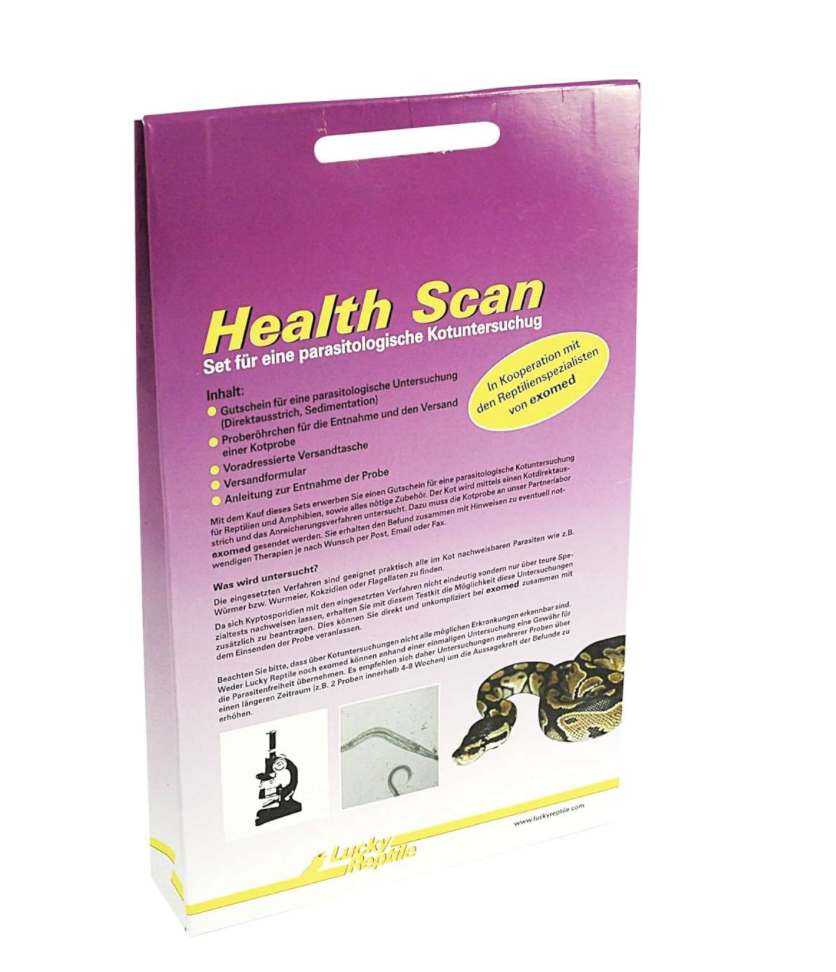 Produktinformationen "Lucky Reptile Health Scan" Mit dem Lucky Reptile Health Scan-Parasitentest erwerben Sie einen Gutschein für eine Kotprobenuntersuchung bei dem renommierten Labor EXOMED. Ebenfalls enthalten ist das notwendige Zubehör für die Probenentnahme sowie eine ausführliche Anleitung, die erklärt, wie und wann man eine Kotuntersuchung machen sollte. Da eigentlich alle Tiere Parasiten aufweisen ist es wichtig, regelmäßig Kotproben untersuchen zu lassen, damit man gegebenenfalls rechtzeitig reagieren kann. Besonders bei Neuzugängen, vor Vergesellschaftungen und vor der Winterruhe sollte man eine Kotprobe untersuchen lassen. Wir freuen uns, mit EXOMED die führenden Reptilienspezialisten als Partner gewonnen zu haben. Nach Einsenden der Probe nach BERLIN erhält man den Befund und gegebenenfalls Behandlungshinweise. Der Befund kann per Fax, Brief oder Email versendet werden und z.B. auch direkt Ihrem Tierarzt zur Verfügung gestellt werden. Man hat auch die Möglichkeit weitere Tests, wie z.B. auf Cryptosporidien, direkt bei EXOMED mit zu beauftragen.