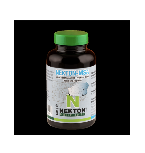 Produktinformationen "Nekton MSA" NEKTON-MSA ist eine mit Vitamin D3, Mengen-/Spurenelementen und Aminosäuren ergänzte, hochwertige Mineralstoffmischung. NEKTON-MSA unterstützt und versorgt Stoffwechsel und Knochen, verhindert Rachitis, aktiviert den Stoffumsatz und hilft Schäden durch Calciummangel auszugleichen. NEKTON-MSA deckt den erhöhten Bedarf an Mineralstoffen in der Zucht/Aufzucht, schützt vor Resorptionsstörung, steigert die Infektionsabwehr und verhindert Eibrüchigkeit beim Vogel. NEKTON-MSA unterstützt beim Jungtier einen guten Aufbau der knöchernen Strukturen. Gerade beim Jungtier ist dies besonders wichtig um späteren Erkrankungen verursacht durch Mangelversorgung an Vitaminen und Mineralien vorzubeugen. NEKTON-MSA ist nicht wasserlöslich und problemlos unter das Weichfutter oder den Vogelgrit zu mischen.