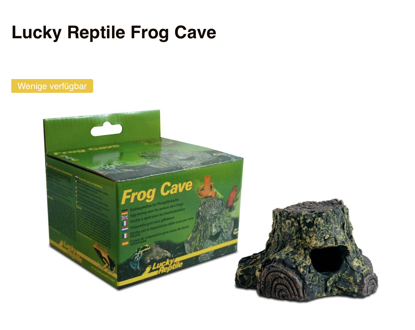 Produktinformationen "Lucky Reptile Frog Cave" Die Lucky Reptile Frog Cave wurde speziell für Pfeilgiftfrösche entwickelt, da viele Pfeilgiftfroscharten ihre Eier in kleine Höhlen ablegen. Die Frog Cave entspricht den natürlichen Eiablagestellen und bietet den Tieren so im Terrarium einen sicheren und gut kontrollierbaren Eiablageplatz. Bestandteil des System ist eine Schale, die man mit Wasser füllt, und in der die Frösche dann ihre Eier/Kaulquappen ablegen. Die Schale kann einfach entnommen und die Kaulquappen somit kontrolliert aufgezogen werden. Die Frog Cave ist aus robusten Kunstharz gefertigt, wirkt sehr natürlich und kann gut gereinigt werden. ca. 12,5 x 11,5 x 7cm