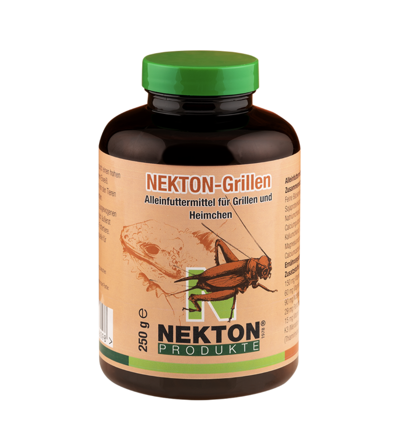 Produktinformationen "NEKTON-Grillen-Zuchtkonzentrat 250g" Alleinfuttermittel für Grillen und Heimchen NEKTON-Grillen-Zuchtkonzentrat ist eine fertige Mischung und enthält alle lebensnotwendigen Eiweiße tierischer und pflanzlicher Herkunft, Vitamine und Mineralien (Mengen- und Spurenelemente). Es ist keine weitere Zufütterung nötig! Als Wasserquelle empfehlen sich Gurkenscheiben. Mit dem NEKTON-Grillen-Zuchtkonzentrat werden die ernährungsspezifischen Bedarfswerte der Grillen und Heimchen, welche sich von pflanzlichen und tierischen Stoffen ernähren, berücksichtigt. Durch die reich enthaltenen wertvollen Inhaltsstoffe entwickeln sich gesunde, hochwertige und große Futtertiere als optimale Futterquelle für Reptilien und Vögel. Die Puderform begünstigt für die Grillen und Heimchen die Aufnahme des Zuchtkonzentrates. Anwendung: NEKTON-Grillen den Heimchen und Grillen in einem geeigneten Gefäß anbieten. Zur Trinkwasserversorgung empfehlen sich Gurkenscheiben. Lagerung: NEKTON-Grillen-Zuchtkonzentrat sollte trocken ohne Sonneneinstrahlung, zwischen 15 °C und 25 °C, gelagert werden. NICHT IM KÜHLSCHRANK LAGERN!!! Empfehlung: Desinfizieren Sie Trinkgefäße und Futterbehälter täglich mit NEKTON-Desi-Natural um eine hygienisch einwandfreie Fütterung zu gewährleisten!