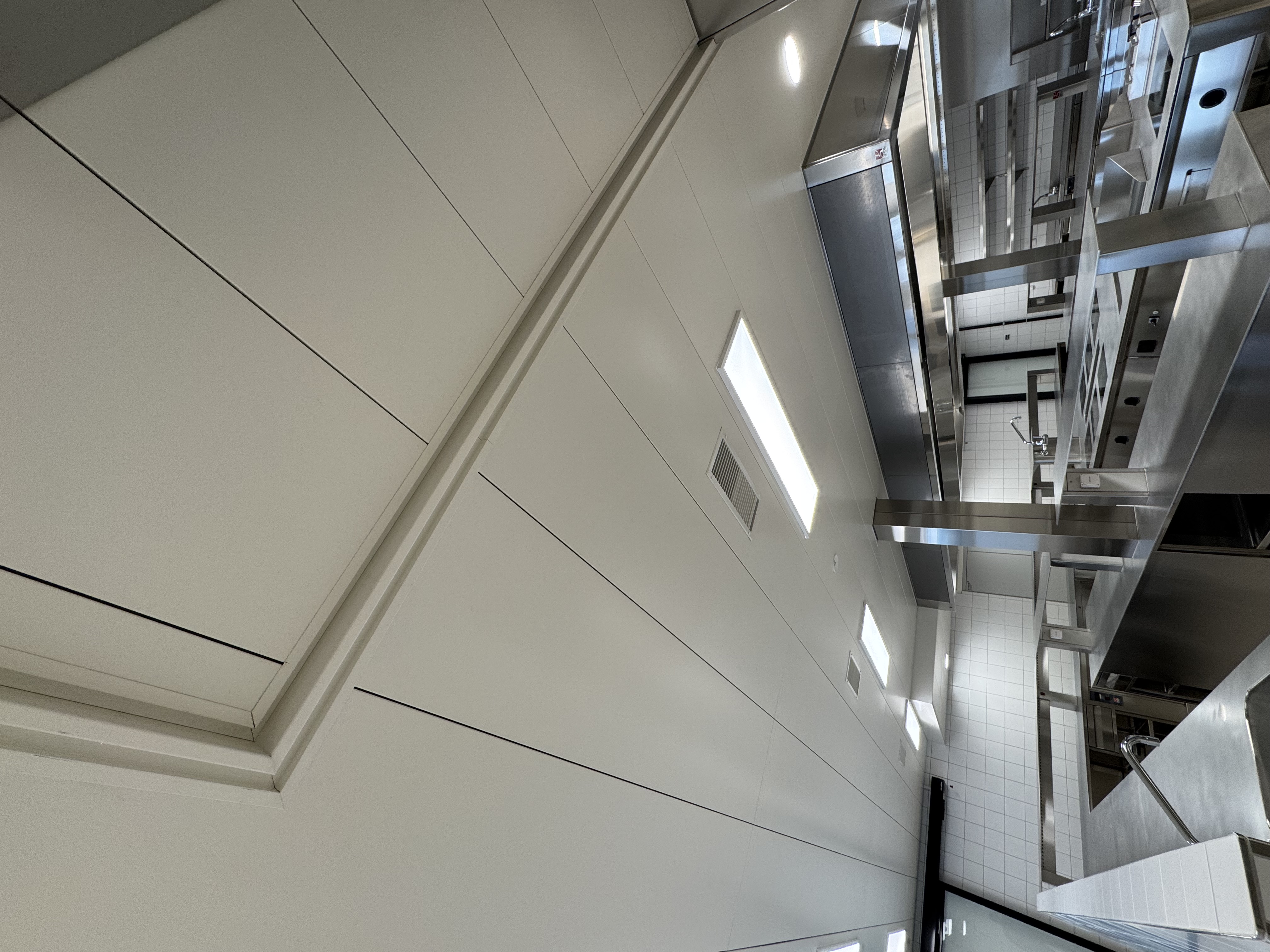 Dans cette cuisine professionnelle, nous avons mis en œuvre un faux-plafond en bacs métalliques lisses, spécialement conçu pour répondre aux exigences élevées des environnements techniques et alimentaires. Ce système garantit une hygiène optimale, un entretien simplifié et une résistance durable face aux contraintes liées à l’humidité, à la chaleur et aux nettoyages fréquents. Le faux-plafond permet également une intégration précise et fonctionnelle des équipements techniques (éclairage, ventilation, sprinklers), tout en assurant un rendu sobre et professionnel.