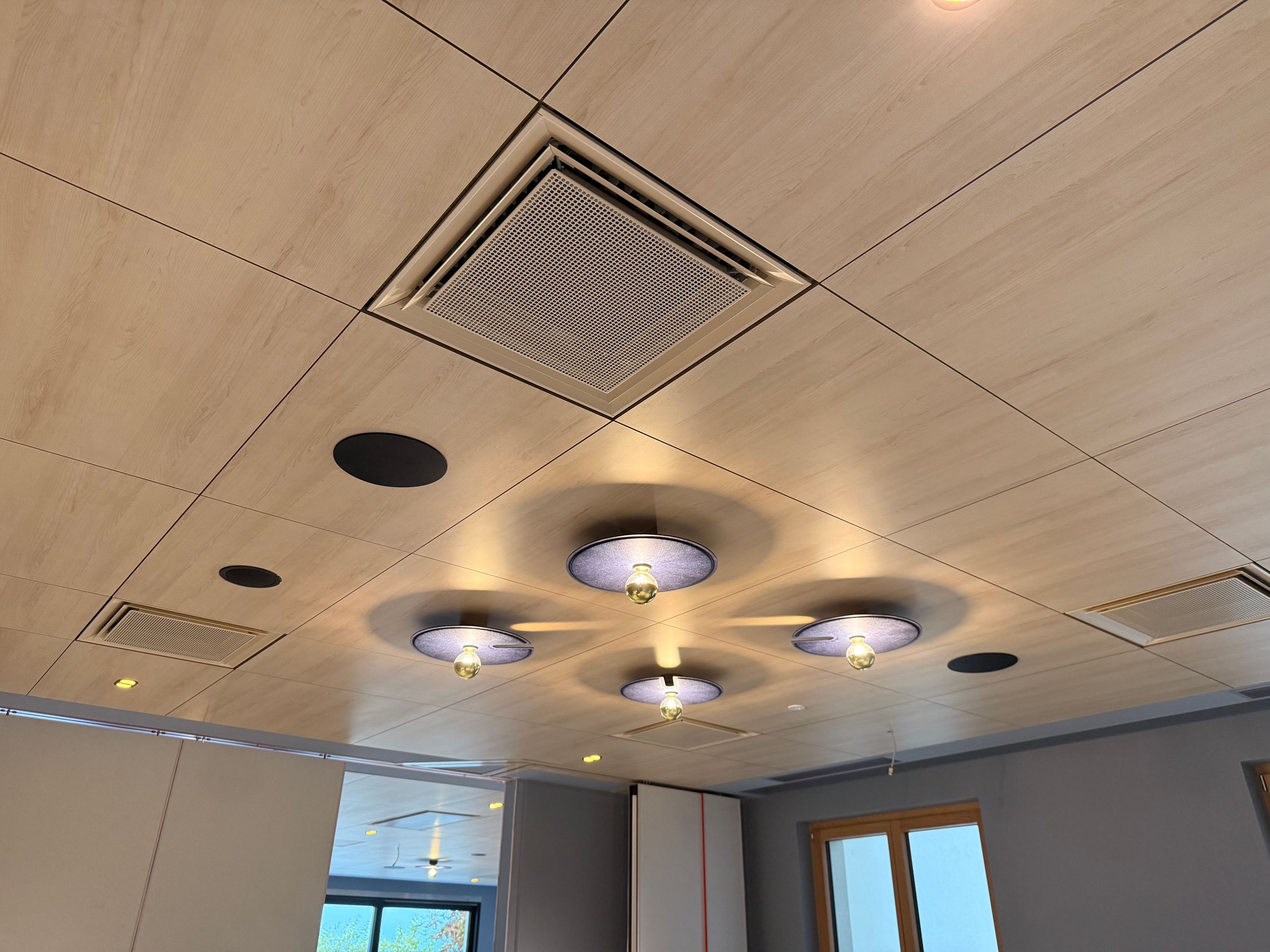 Dans le cadre de la modernisation du centre biométrique de Lausanne, nous avons réalisé un faux-plafond acoustique avec des baffles acoustiques. Ces dernières atténuent le bruit dans des environnements où la concentration et la confidentialité sont essentielles, garantissant un cadre plus calme, fonctionnel et agréable pour les utilisateurs comme pour les collaborateurs.