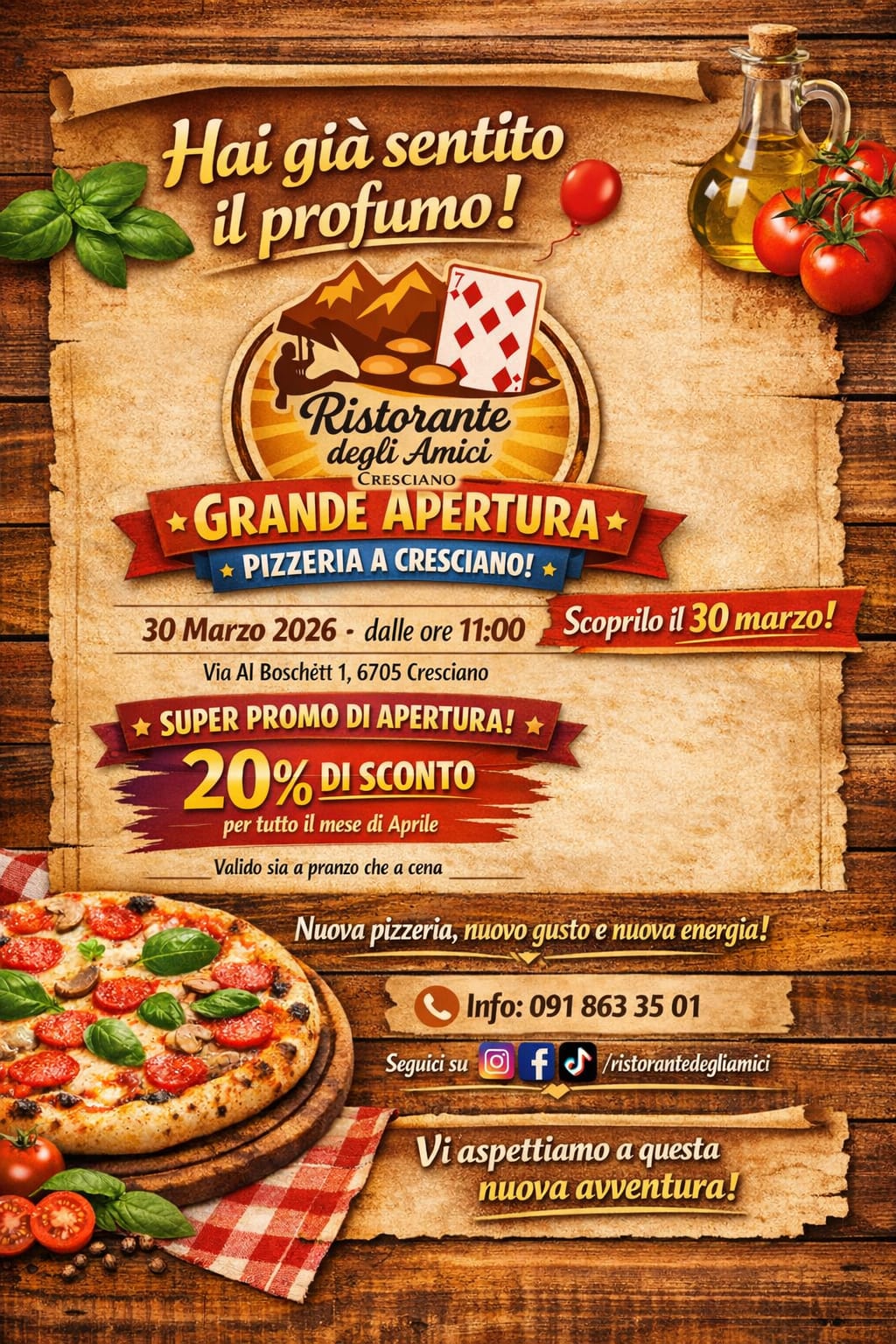 Dal 30 Marzo al Ristorante degli Amici non troverai solo il menù ristorante, ma anche una stupenda lista con le Pizze più buone dalla tradizione. Che aspetti, vieni a provarle! Per te un 20% di sconto FINO A FINE APRILE per darti un motivo in più di venire a trovarci e farci sapere quanto ti piacerà la nostra PIZZA