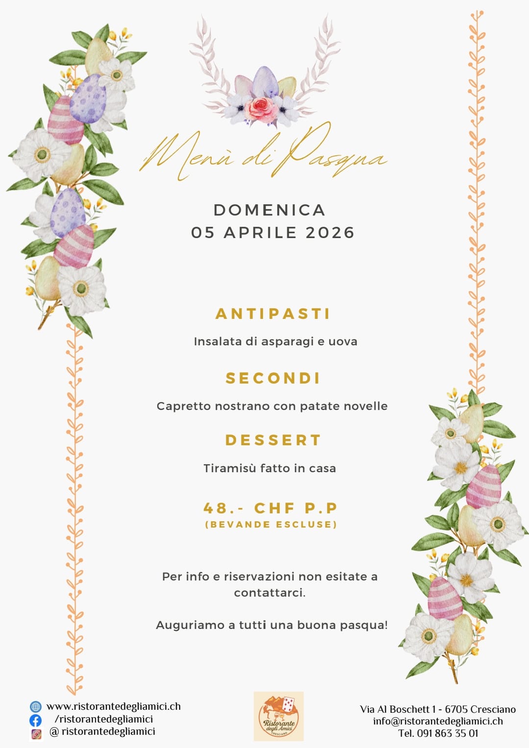 Pasqua con chi vuoi? Hai voglia di passarla con la giusta compagnia sia di cibo che di Amici!Abbiamo tutto noi! Cibo, compagnia, allegria e tanti AmiciPrenotazioni aperte, chiamaci 091 863 35 01 Menù di Pasqua DOMENICA 05 APRILE 2026 ANTIPASTI Insalata di asparagi e uova SECONDI Capretto nostrano con patate novelle DESSERT Tiramisù fatto in casa 48.- CHF P.P(bevande escluse) Per info e riservazioni non esitate a contattarci. Auguriamo a tutti una buona pasqua!