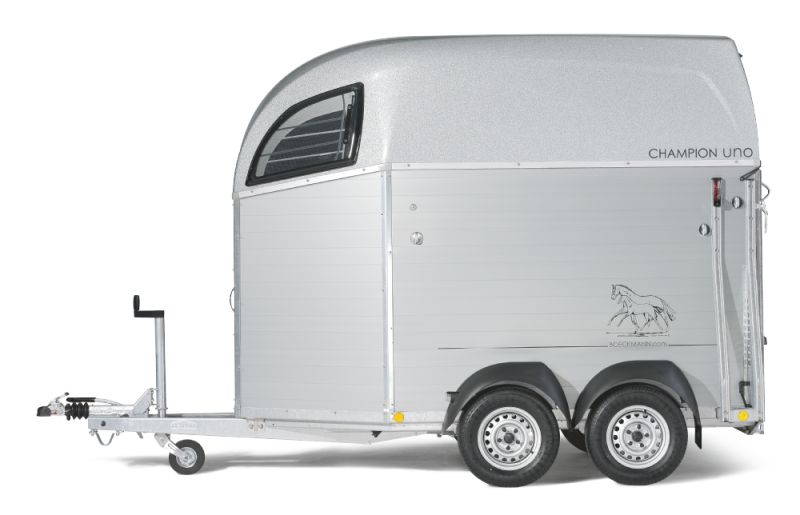 Böckmann Champion Uno C - Gesamtgewicht:1600 kg - Nutzlast:840 kg - Innenmaß (L × B × H):3100 x 1300 x 2300 mm - Aussenmass (L x B x H):4490 x 1830 x 2730 mm - Anzahl Pferde:1 - Farbe Polyhaubesilber mét. - Farbe WändeAluminium grau - SonderausstattungSattelkammer