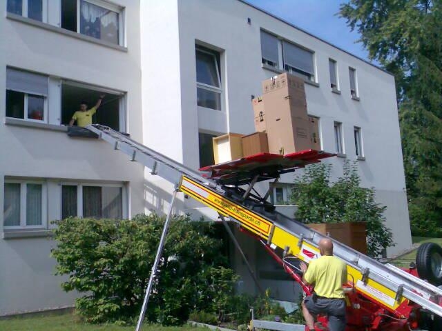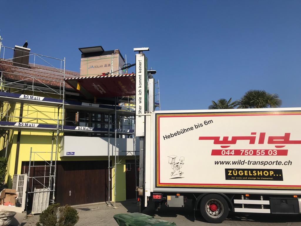 Mit der Spezial-Hebebühne, welche bis 6m ab Boden in die Höhe reicht, können wir direkt ans Haus andocken, und so fällt das schwierige Hochtragen übers Treppenhaus dahin. Geht natürlich nur, wenn der LKW Zufahrt bis an Haus hat.