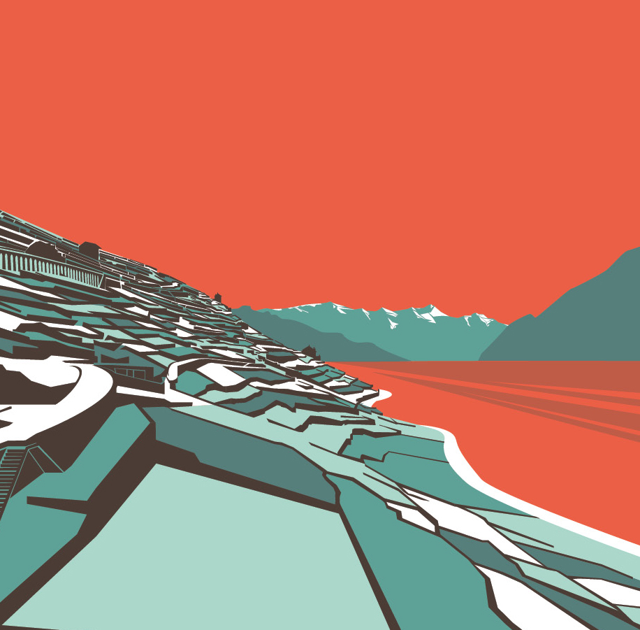Illustrations originales de paysages de Lavaux sur le thème du Pop art. L’interprétation graphique s’inspire à la fois des affiches touristiques du début du 20e siècle et du traitement psychédélique de la couleur dans le mouvement du pop art. La volonté est de mettre en exergue la mosaïque des paysages façonnés par l’être humain en opposition aux grandes étendues vierges de toutes interventions.