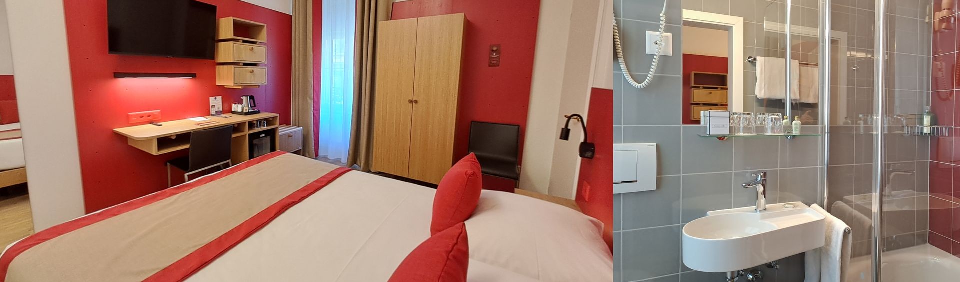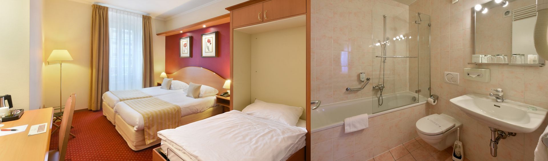 Parfaites pour les séjours en couple ou entre amis, les chambres doubles permettent de cohabiter de manière confortable. La proximité de l'hôtel des rives du lac Léman, du centre de la ville et des organisations internationales vous permettra de visiter la ville de Genève en toute liberté. Décorées dans les tons pastel et disposant de meubles confortables et agréables, nos chambres doubles sont parfaites pour les séjours en couple ou entre amis. La situation idéale de l'hôtel, proche du lac et du centre de Genève, vous garantit la proximité avec les meilleures activités de Genève.Réservation en ligne ÉQUIPEMENT DE NOS CHAMBRES DOUBLES - grand lit (160X200) ou 2 lits simples (90x200) - bureau - minibar - télévision haute définition - salle de bains avec baignoire ou douche AUTRES FACILITÉS OFFERTES DANS LES CHAMBRES DOUBLES - coffre-fort - connexion WIFI gratuite - sèche-cheveux - plateau de courtoisie café-thé en chambre