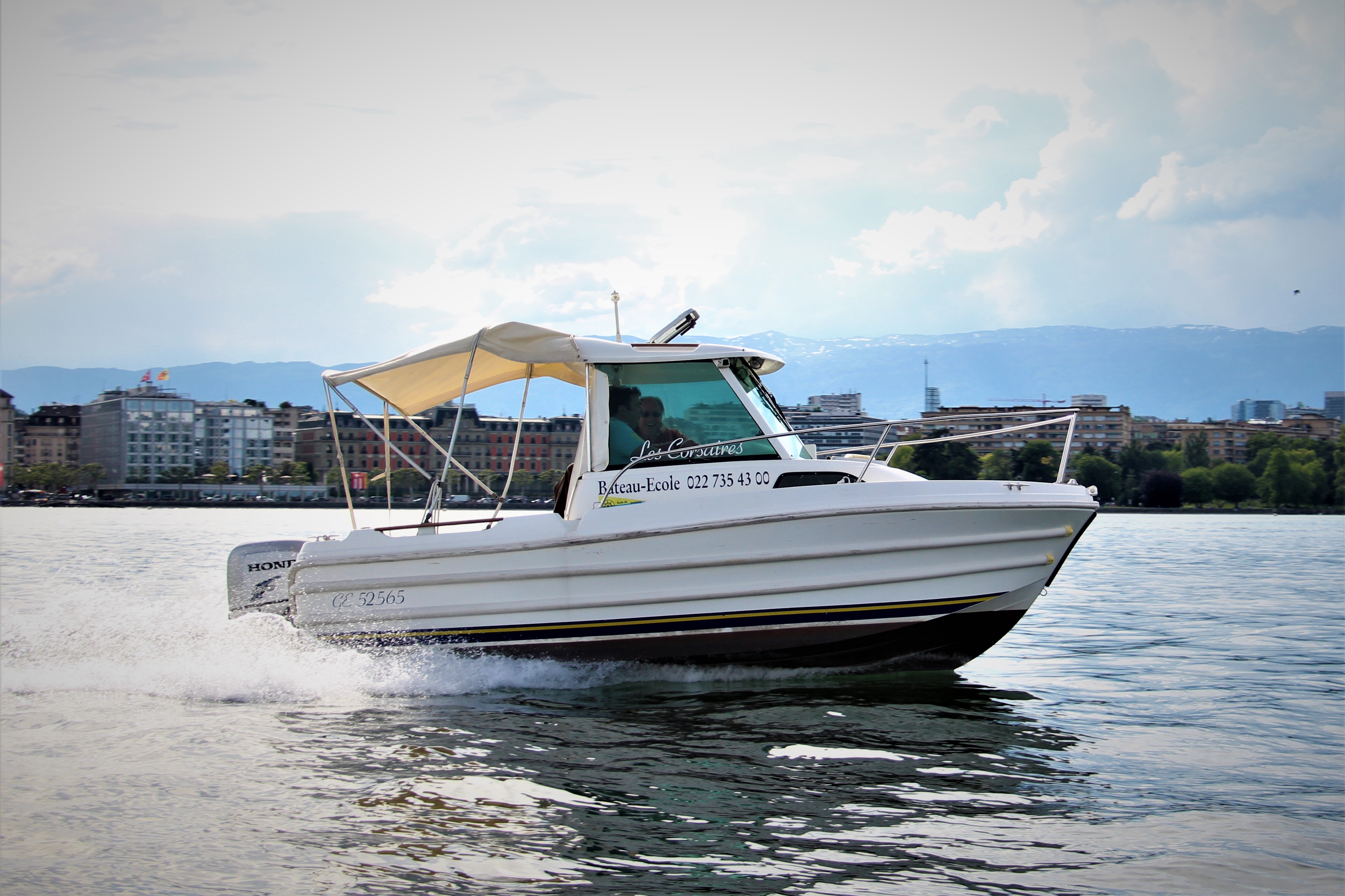 Cours d'une heure. Préparation au permis A. D'avril à novembre, sur rendez-vous - 7j/7 "Merry-Fisher" - 5.22 m x 2.28 m - 800 kg Moteur hors-bord - 75 CV Timonerie abritée et chauffée ! A l'ombre - Au sec - Au chaud en hiver. Réservation à notre école, Les Corsaires, quai Gustave-Ador 33, 1207 Genève, 022 735 43 00, ecole@lescorsaires.ch