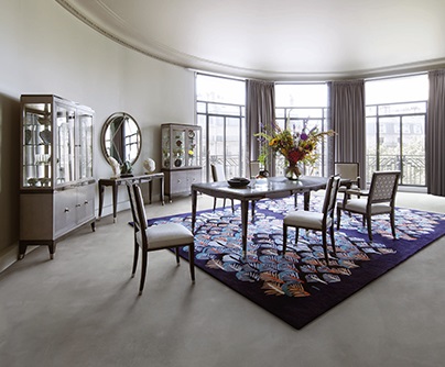 Salle à manger: table de repas, L. 200 x H. 76 x P. 100 cm (1 allonge de 90 cm), plateau finition décorateur Grège. Vitrine L. 111 x H. 193 x P. 39,5 cm, 4 portes, intérieur étagères verre et étagère bois. Structure frêne plaqué sur latté. Piétement frêne massif avec sabots en laiton argenté. Finition haute brillance fumée. Console L. 160 x H. 76 x P. 38 cm. Chaise L. 50 x H. 99 x P. 45,5 cm et bridge L. 61 x H. 99 x P. 64 cm, revêtus de tissus. Miroir Osange, design Alnoor. Tapis Kyoto, design Corinne Hellein. Fabrication européenne.