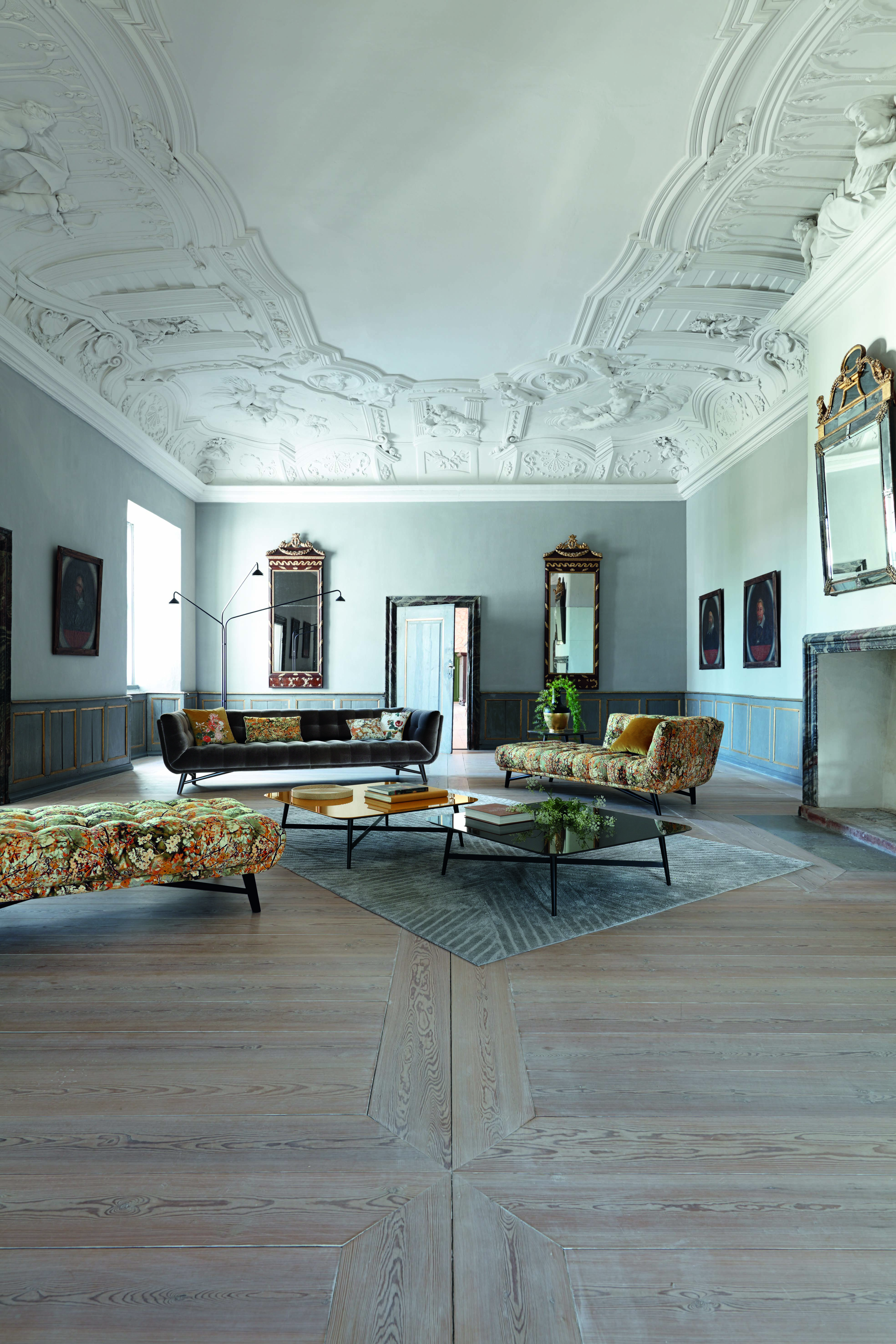 Canapé 4 places, L. 279 x H. 76 x P. 95 cm. Velours Cabaret. Assise, dos et accoudoirs capitonnés. Piétement hêtre massif teinté wengé (disponible en teinte grise). Chaise longue, pouf et coussins habillés de tissu Jean Paul Gaultier Sakura Doré. Tables basses Octet, design Roberto Tapinassi & Maurizio Manzoni. Lampadaire Nomade, design Carlo Zerbaro. Fabrication européenne.
