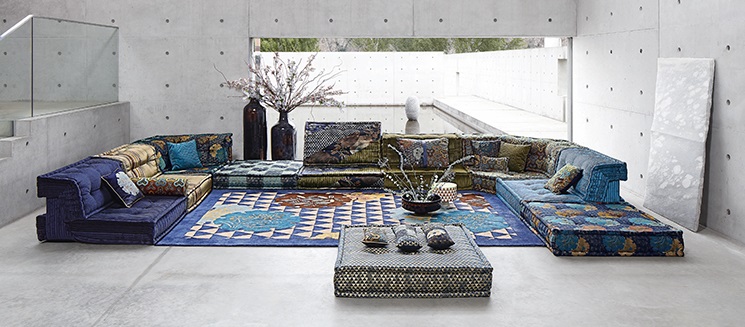 Kenzo Takada habille le Mah Jong. Designer libre et audacieux, Kenzo Takada, «le plus parisien des créateurs japonais», a imaginé pour Roche Bobois une exceptionnelle collection de tissus et de céramiques. Pour habiller le canapé Mah Jong, il s’est inspiré des kimonos anciens du théâtre Nô dont il a réinterprété les motifs et les couleurs, créant des harmonies à la fois délicates et sophistiquées qui symbolisent les trois temps de la journée: Asa (le matin), Hiru (le midi), Yoru (le soir). Canapé composable par éléments, L. 95 x H. 19 x P. 95 cm. Tissus dessinés par Kenzo Takada, collection Nō Gaku version Yoru. Système modulaire composable à l’infini à partir de coussins d’assise et de dossiers droits et d’angles (H. 53 cm). Tous les éléments sont capitonnés, matelassés et réalisés à la main. Mécanisme de dossier relevable et petits coussins en option. Fabrication européenne. Collection de céramiques Aka et tapis Gara_Juutan dessinés par Kenzo Takada.