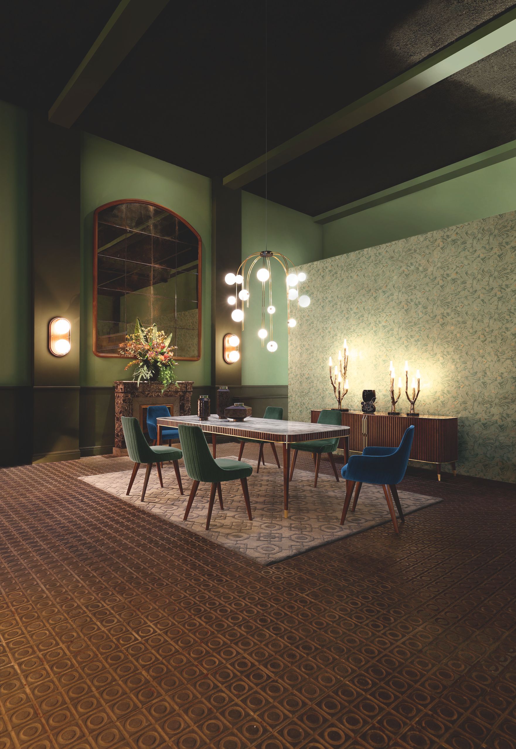 Table de repas, L. 242 x H. 76 x P. 101 cm. Structure en merisier massif teinté. Plateau en marbre de Carrare finition vernis hydrofugé. Filets et sabots en laiton brossé. Autres dimensions et version avec allonge disponible. Buffet, L. 220 x H. 77 x P. 58 cm. Chaises, L. 55 x H. 86 x P. 58 cm. Bridges, L. 61 x H. 86 x P. 58 cm. Suspension Médusa, design Carlo Zerbaro. Fabrication européenne.