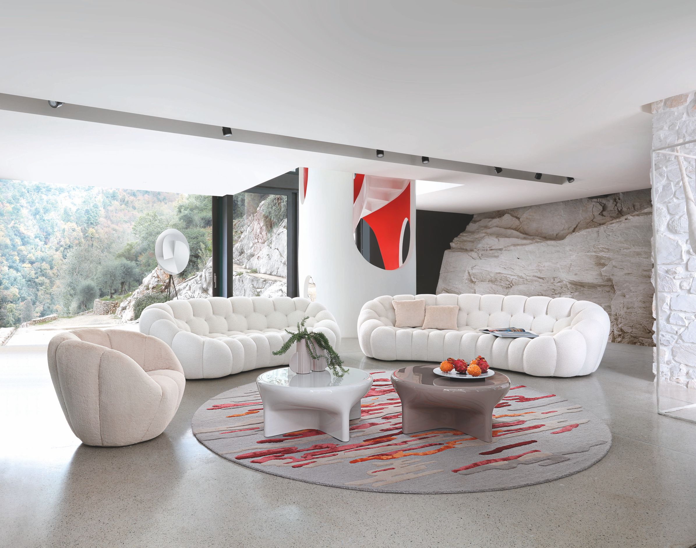 Canapé 3-4 places arrondi habillé de tissu Orsetto Flex. L. 248 x H. 80 x P. 132 cm. Existe dans d’autres dimensions. Coussins déco en option. Fauteuil Astréa, tissu Douceur, design Sacha Lakic. Tables basses Rocket, design Nathanaël Désormeaux & Damien Carrette. Fabrication européenne. Tapis Sun Tropic, design Nany Cabrol.