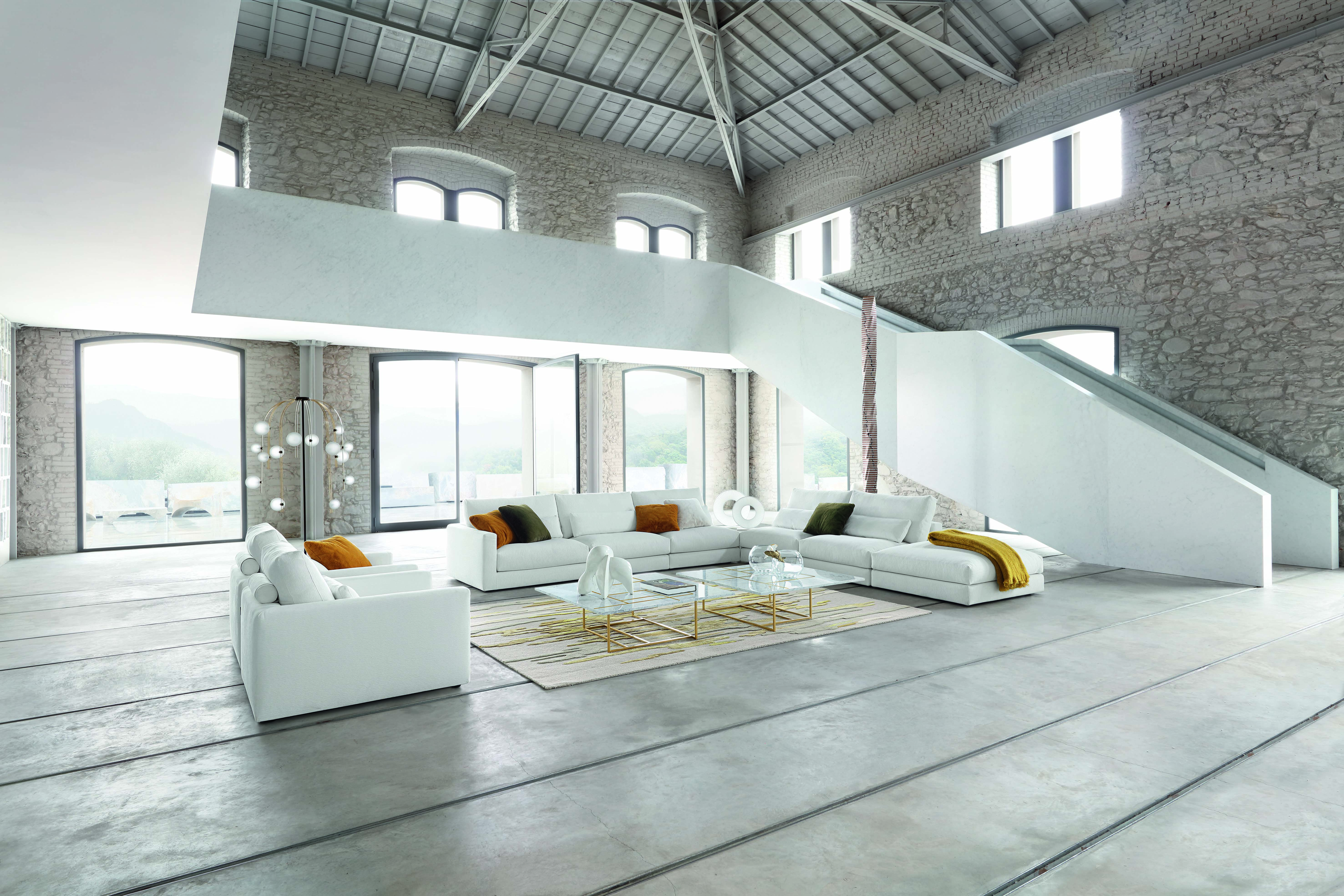 Canapé modulable habillé de velours côtelé Arianna. Entièrement déshabillable. Coussins d’assise et de dossiers en plumes d’oie et canard. L. 431/431 x H. 89 x P. 115 cm. Existe dans d’autres dimensions. Tables basses Long Beach, design Philippe Bouix. Lampadaire Médusa, design Carlo Zerbaro. Fabrication européenne. Tapis Sun Désert, design Nany Cabrol.