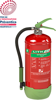 Grâce à son agent extincteur naturel, la gamme d'extincteurs Lith-EX permet d'éteindre les feux de batteries Lithium-Ion et isole les cellules pour empêcher toute propagation et emballement thermique. - Disponible en Aérosol 500ml et en extincteurs portatifs 1L, 2L, 6L, 9L - Appareils sur roues : 25L, 50L et 100L - Innovation exclusive reconnu par le prix de l'innovation PREVENTICA Marseille 2019 - Agent extincteur inoffensif pour les personnes, les biens et l'environnement.