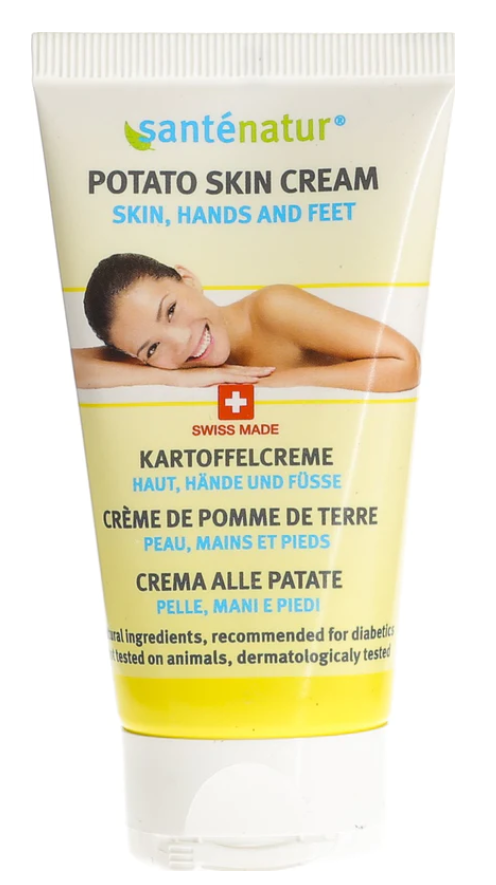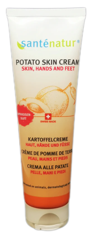 Santénatur Kartoffelcrème „Haut, Hände, Füsse“ aus Ihrem Fachgeschäft ist ein einzigartiges Produkt für gepflegte Hände und Füsse. Diese gibt es jetzt neu mit erfrischendem Aprikosen-Duft! Die Kombination enthält einen grossen Anteil Kartoffelsaft (Bio/Schweiz oder Deutschland) aus frischen Kartoffeln. Die Haut wird weich, geschmeidig, und gepflegt genau wie beim Original. Die Creme fettet nicht, zieht schnell ein und macht die Haut wunderbar weich. Zur Vorbeugung gegen Hornhaut und zur Stärkung stark strapazierter Haut. Besonders zur täglichen Pflege der Haut geeignet - den ganzen Tag über. Die Hauptgrundstoffe sind Kartoffelsaft, Jojobaöl, Mandelöl und pflanzliche Wachse/Öle.