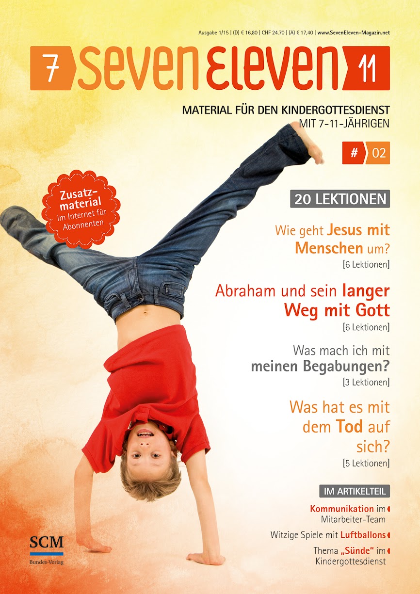 Kinder fragen anders. Ihren Fragen begegnet das Kindergottesdienst-Material SevenEleven. Aufbauend auf "Kleine Leute - Grosser Gott" bietet die Materialzeitschrift SevenEleven 20 Lektionen, zusätzliches Online-Material und begleitende Schulungen für die Arbeit mit Kindern zwischen 7 und 11 Jahren in Kindergottesdienst, Schule und Gemeinde. Die Lektionen laden Mitarbeiter und Kinder ein, gemeinsam Gott und den Glauben an ihn zu entdecken und zu erleben. SevenEleven kennenlernen oder abonnieren.