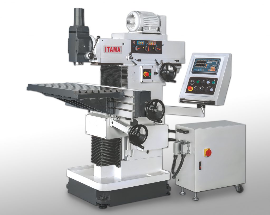 ITAMA FU 120 A Beschreibung: Konventionelle Fräsmaschine, Fahrwege X/Y/Z 585/465/385 mm Tischgrösse 500x900 mm, Drehzahlen 40-2000 U/min, Motor 3,75 KW, ISO 40, Eilgänge optional mit Digitalanzeige
