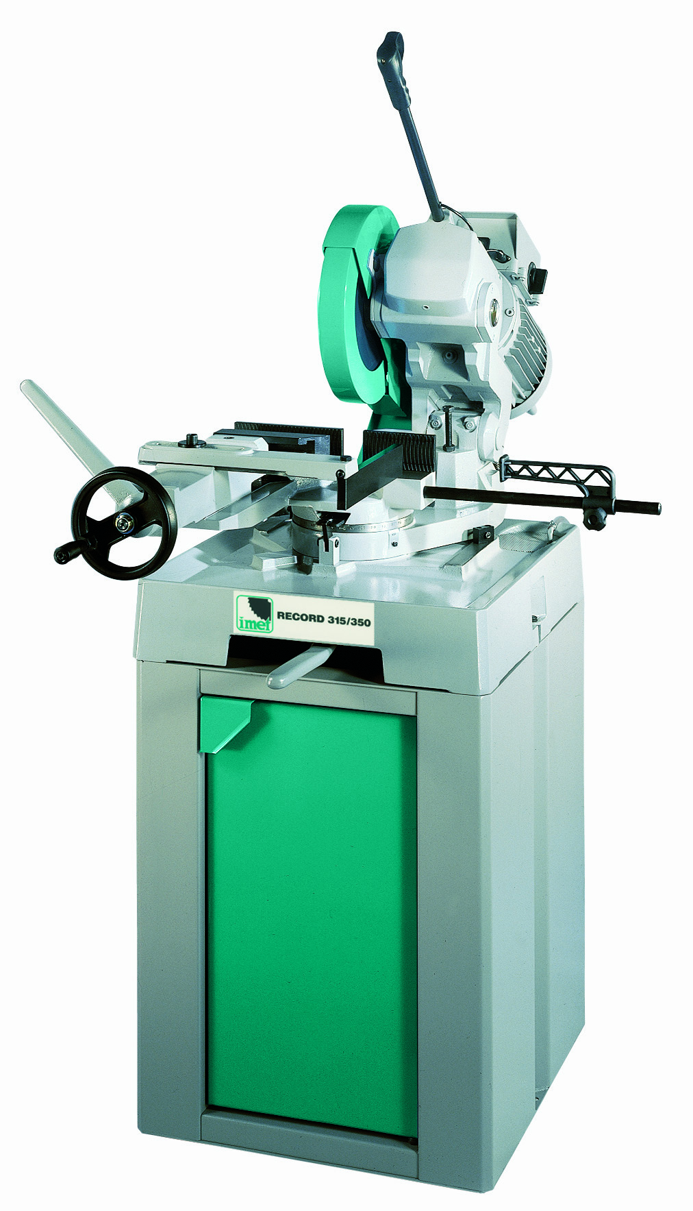 IMET RECORD 315/350 Beschreibung: Kreissäge, auf Kastenständer Sägeblatt Ø 315 mm, Schnittleistung rund 110 mm, Gehrungsschnitt 45° li + re, Motor 2-tourig mit Schnellspann-Schraubstock, Längenanschlag