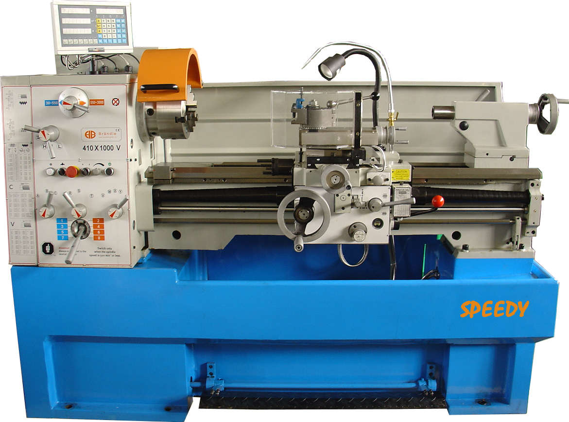 Konventionelle Drehmaschine TOPTECH SPEEDY 410 V Spitzenhöhe 205 mm, Spitzenweite 1000 mm, Spindelbohrung Ø 52 mm Motor 5,5 KW, Drehzahl 30 - 3000 U/min. stufenlos mit Digitalanzeige auf 3 Achsen, Drehfutter, Multifix, Planscheibe, 2 Lünetten, Maschinenleuchte, Kühlmitteleinrichtung