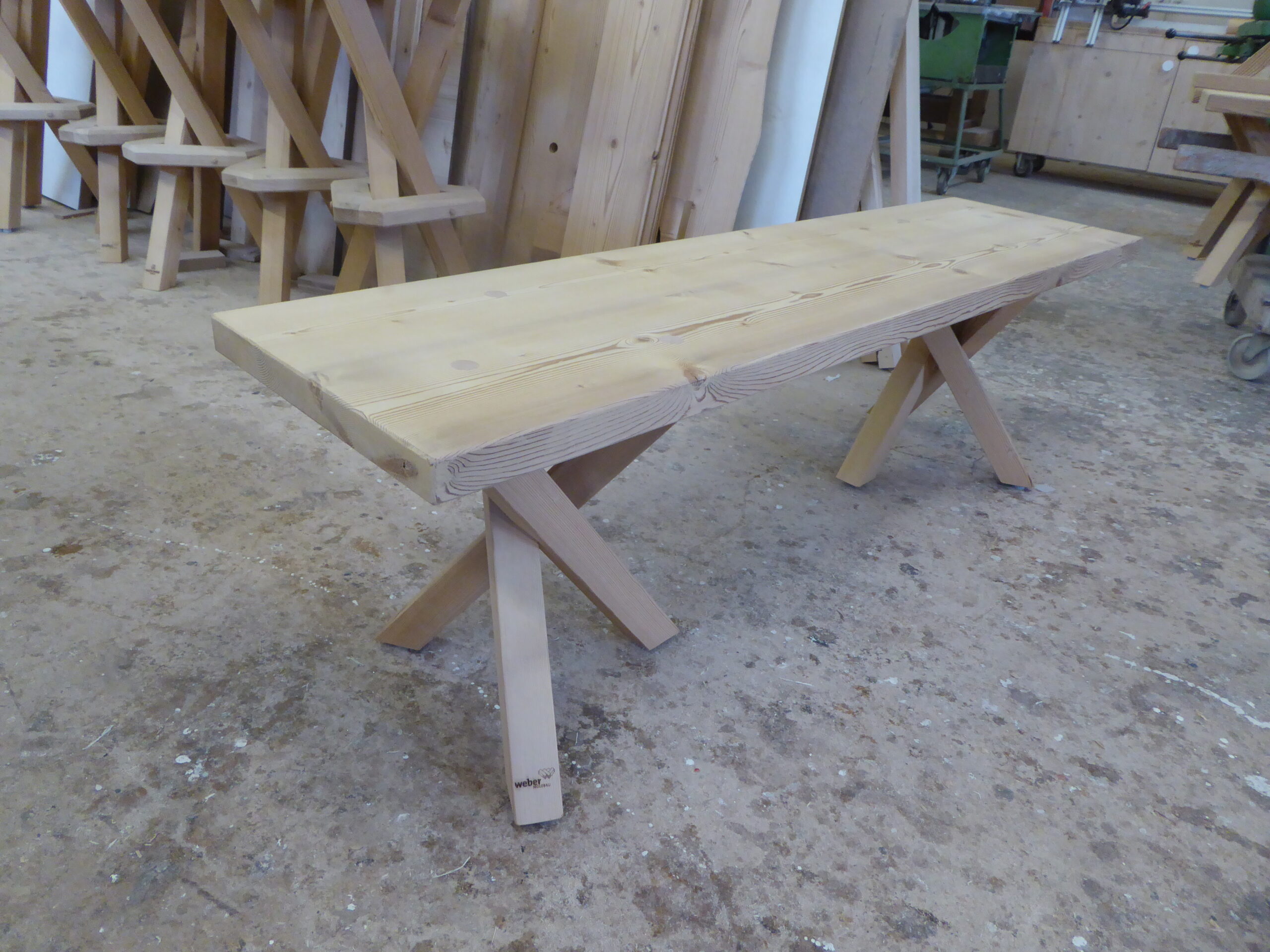 Sitzbank “Alpen Chic” 2 Beine mit je 3 gekreuzten Hölzern Sitzbank aus Fichte gedämpft und gebürstet Grösse 150 x 38 cm / Höhe 45 cm