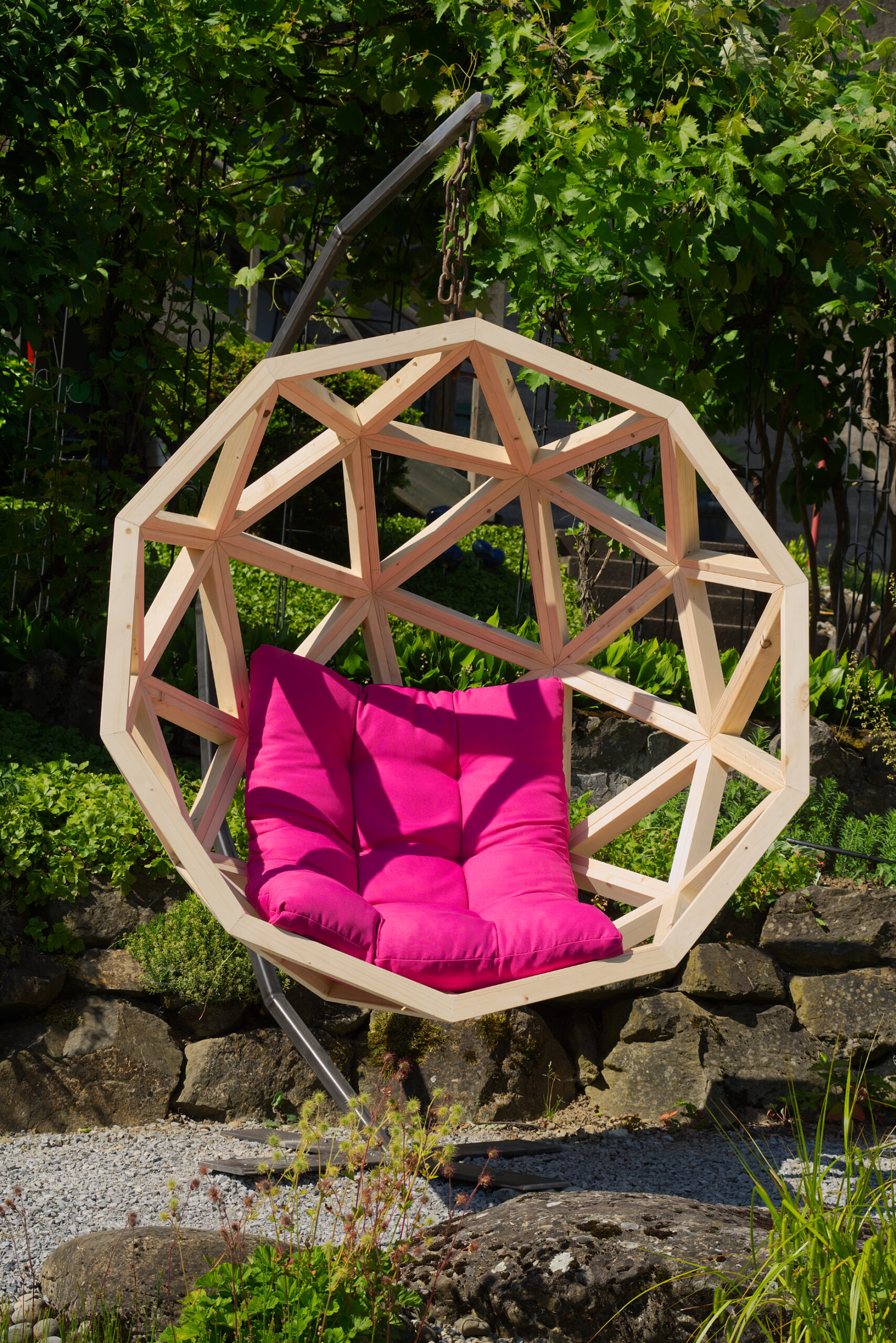 Kugelstuhl “Polyeder” aus mehreren verschiedenen 3-Ecken, 5-Ecken und 6-Ecken hergestellt. Aufhängung/Sockel aus Eisen roh mit Sockelkreuz und geecktem verschweissten Hals. Polyeder mit Eisenkette an Haken aufgehängt. Ideal zum Entspannen und Relaxen und ein Blickfang in Ihrem Garten oder Wohnbereich. Grösse Polyeder 152 x 152 cm Tiefe Polyeder 100 cm Gesamthöhe 244 cm Sockelkreuz 100 x 100 cm