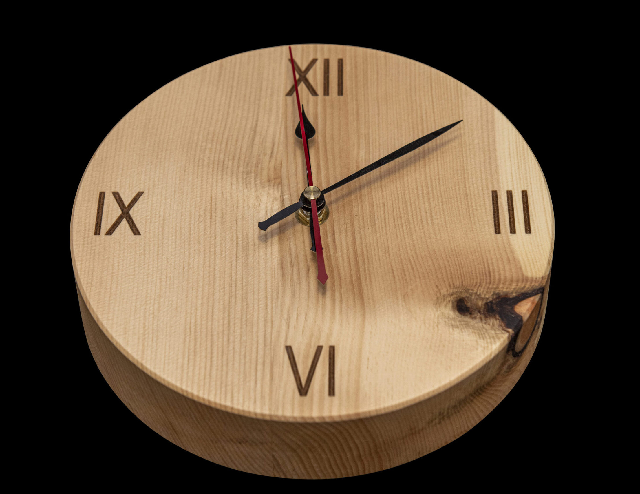 Uhr “Rundarve” aus Massivholz Bündner Arve, Zifferzahlen römisch gelasert Flüsterleises, schleichendes Uhrwerk mit 3 Zeiger. Auf Rückseite Schlupfloch zum Aufhängen. Grösse: Durchmesser 20 cm, Höhe 3.8cm