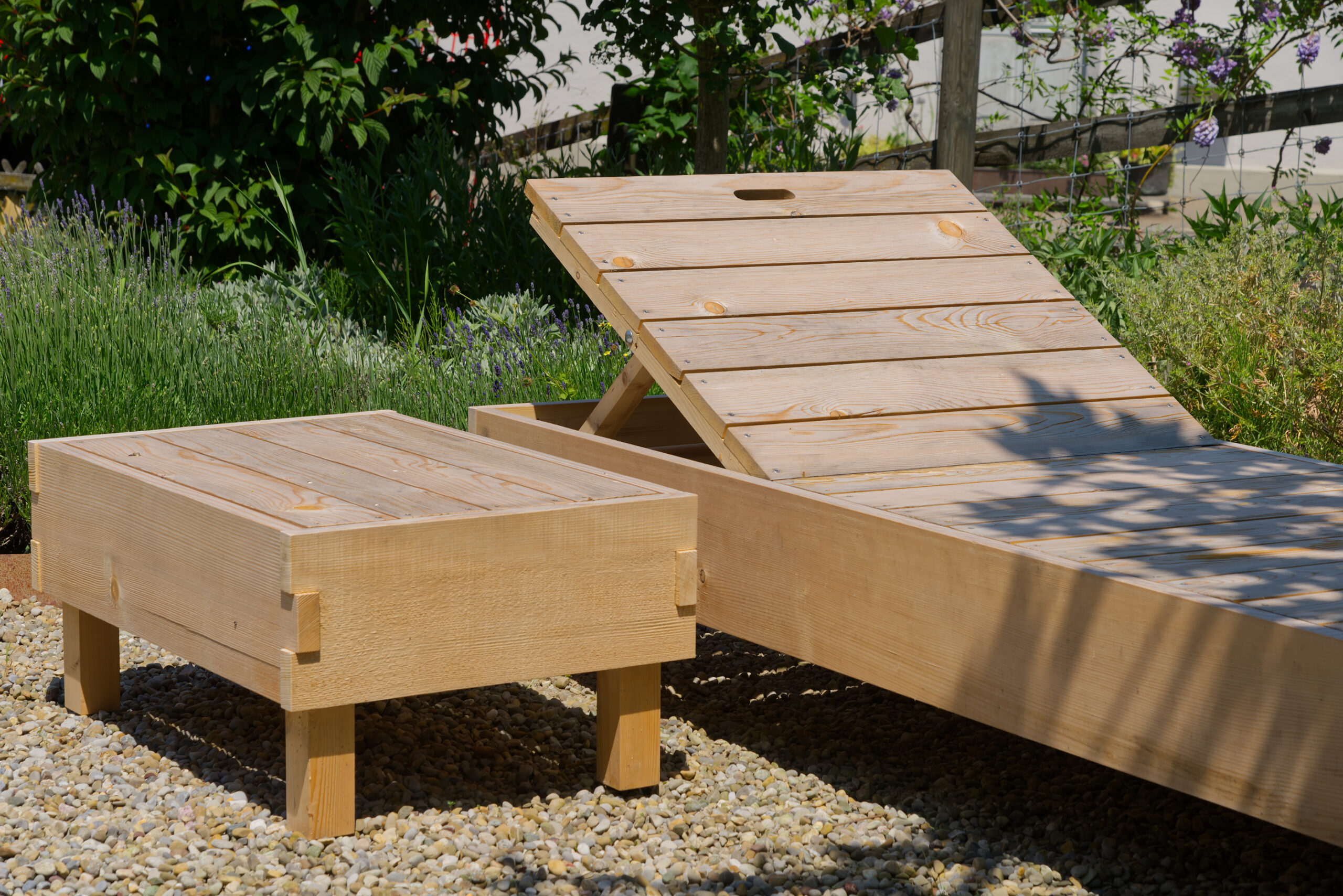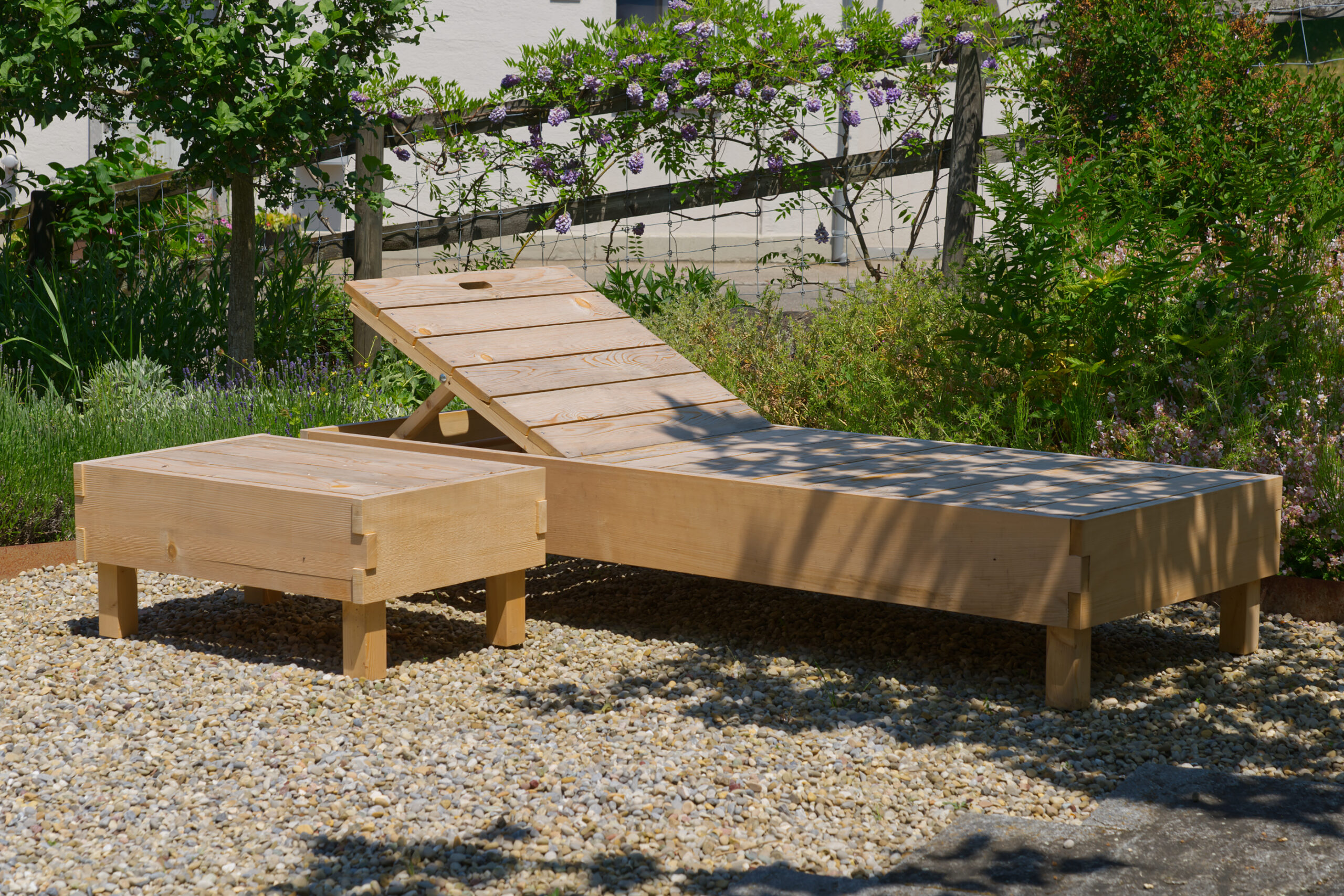 Holzliege massiv hergestellt Rahmen Tanne/Fichte (Schweizer Holz), 2 Längsseiten, 2 Querseiten, Dim 27/200 mm, (aus Rohhobler 30 mm) Aussenseite (Sichtseite) sägeroh, Innenseite gehobelt, Kanten gefast Verbindung von Quer- und Längsseiten gezinkt. Verbindung ca. 5 mm vorstehend und gefast 4 Füsse Tanne/Fichte (Schweizer Holz), Dim 60/60 mm, 4-seitig gehobelt Rost 2-teilig mit 1 Klavierband 20 mm zum Aufklappen, Tanne/Fichte, (Schweizer Holz), 16 Querbretter Dim 20/112 mm, sägeroh, 2 Längsbretter Dim 24/112 mm, 4-seitig gehobelt, alle Kanten ca. 2 mm gefast, Quer- und Längsbretter werden von unten verschraubt mit Schrauben Inox A2 4.5-40 mm 2 Abstützungen für Rückenlehne zum Auf- und Runterlassen mit Rundstab d= 20 mm Buche passend in Rasterlatte Rasterlatte beidseitig mit 4 Ausfräsungen zum Lehne in verschiedenen Neigungen zu verstellen Arretierung mit Ketteli und 2 Ringschrauben. So kann Rückenlehne nicht abgewürgt werden. Auflagerlatte Tanne/Fichte, Dim 27/40 mm, 4-seitig gehobelt, f