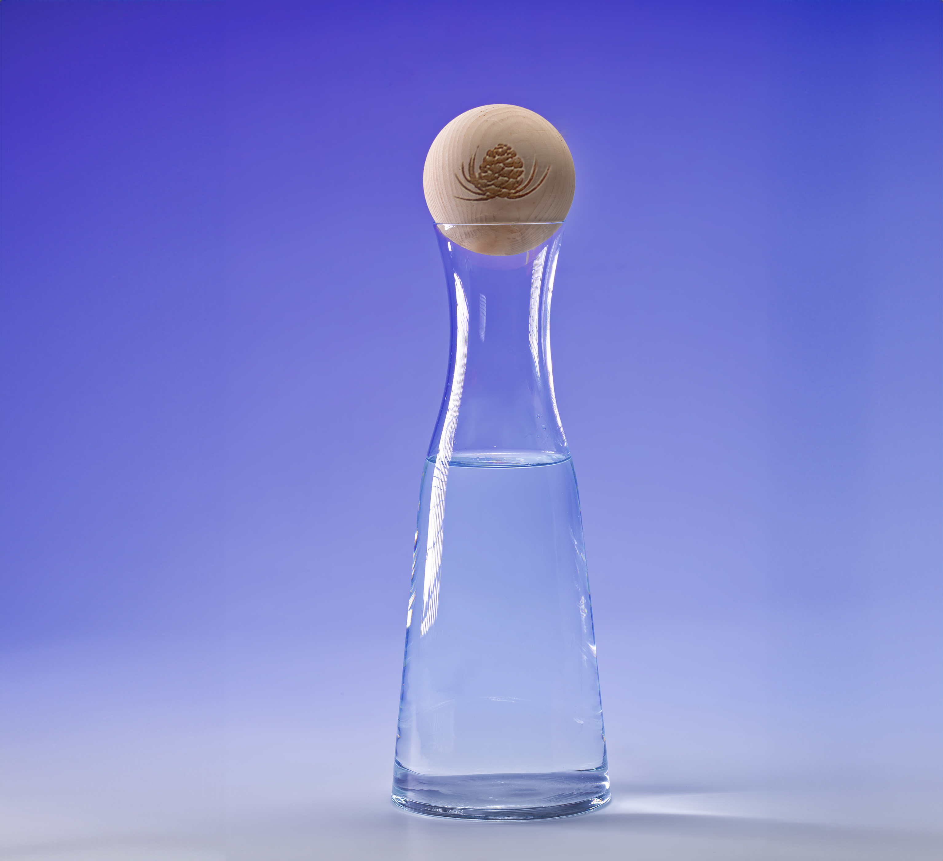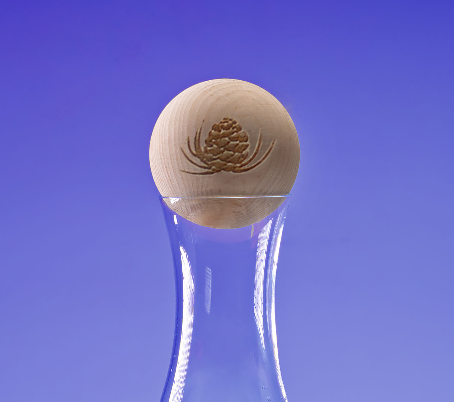 Wasserkaraffe Glas 1 Liter, geeicht Höhe: 28 cm Durchmesser: 10.5 cm Kugel aus Schweizer Arve mit 7cm Durchmesser, gedrechselt/geschliffen, mit Arvenzapfen-Laser-Sujet, auf Karaffenhals passend Die Arvenkugel verschließt die Karaffe, beschützt den Inhalt und bereichert das Wasser mit einem angenehmen Duft und Geschmack – man genießt Schluck für Schluck ein Stück Kraft der Natur. Es sind die ätherischen Öle, die die wissenschaftlich nachgewiesene gesunde Wirkung erzeugen. Legt man die Arvenkugel für ca. 30 Minuten auf den Wasserkrug, gibt sie Duft und Geschmack an das Wasser ab, was ein einmaliges Geschmackserlebnis erzeugt und dem Körper gut tut. Am besten kommen die Aromen im Wasser bei Raumtemperatur zur Geltung. Sie erzeugen ein außergewöhnliches Wasseraroma, denn die Seele der Arve ist sozusagen in das Wasser übergegangen.