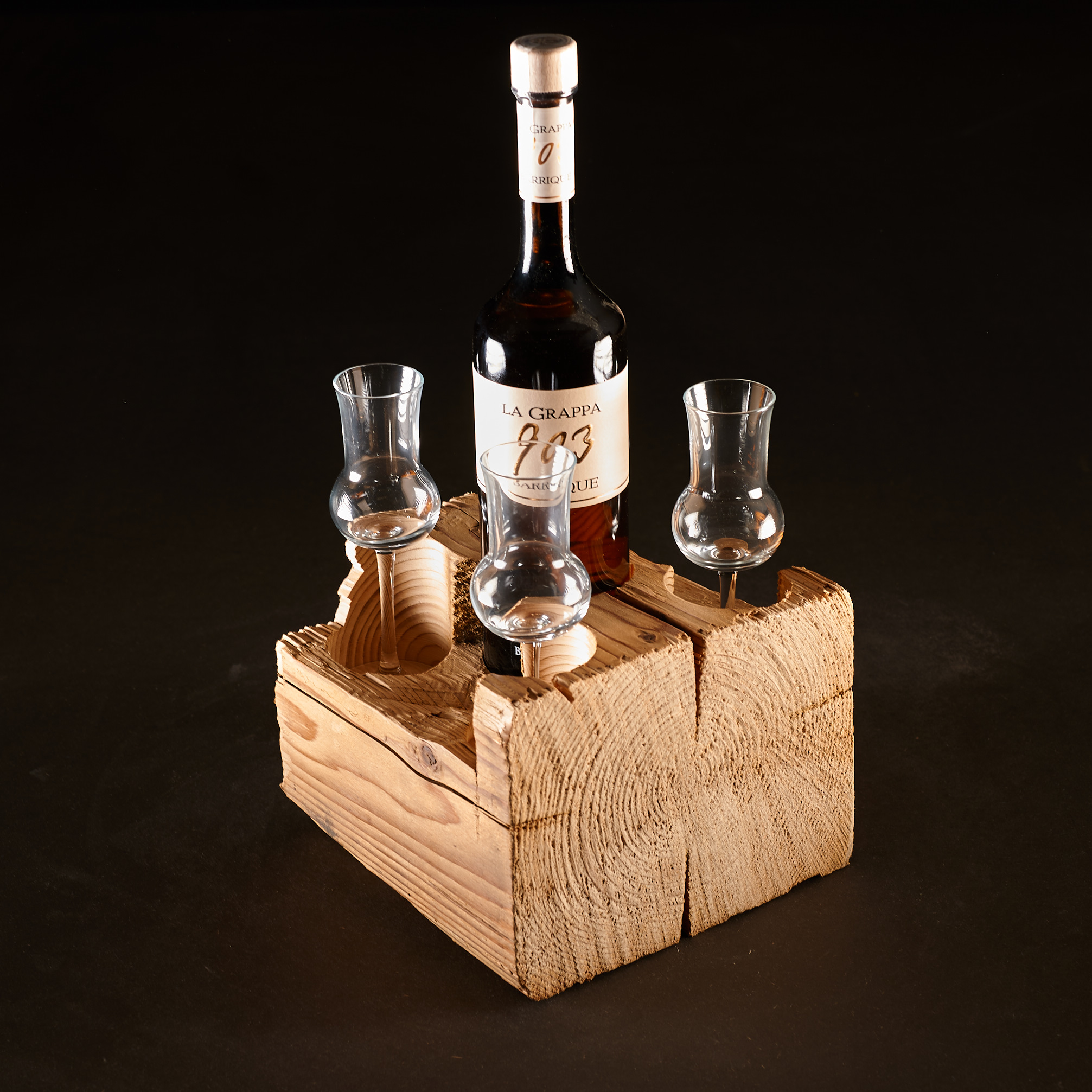 Grappahalter “Grappos” aus Holzklotz Altholz Fichte, rustikal gebürstet, 1 Lochbohrung für Grappaflasche, 4 Lochbohrungen für Grappagläser, 1 Flasche Grappa Barrique 903, 4 Grappagläser “Grappi”. LxBxH 225x160x125 mm