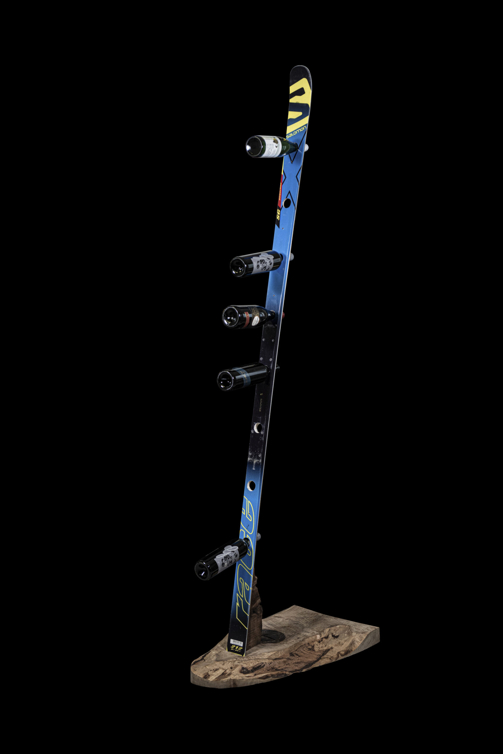 Weinständer mit dem Ski von Marc Berthod, Ski hat Initialen von MB, 8 Bohrungen mit Durchmesser 3.5 cm für Weinflaschen. Ski auf Sockel mit Nussbaumbrett rustikal, geölt. Der Weinständer ist ein Unikat und eine Einzelanfertigung. Skilänge 212 cm Ständerhöhe 209 cm Sockel 70 x 42 x 5.5 cm