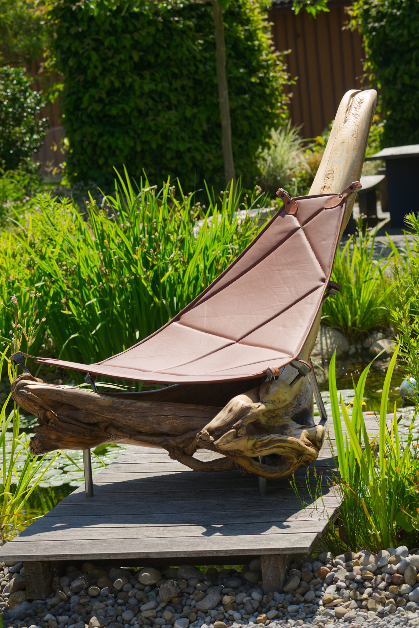Fundholz-Wurzel habe ich mit 2 Weber-Mitarbeitern aus dem Fluss Julia bei Savognin/Tinizong rausgezogen/rausgetragen. Alle drei waren barfuss im Fluss auf den Steinen, das war eine schmerzhafte Reflexzonenmassage an den Füssen. Mich hat sofort die 3-eckig natürliche verwachsene Form, welche die Natur geformt hat, fasziniert. Für mich war klar, dass dies einen Julia-Sessel gibt. Ein Naturleder mit Lederriemen gespannt an die Oesen-Eisenstängeli. Mit 8 Aufhängepunkten für das Leder. In dem Julia-Sessel kann man kreativ sein, nachdenken, visionieren und einfach sein und sich entspannen. In vielen Stunden habe ich den Julia-Sessel geputzt, abgeraspelt, geschliffen, poliert und geölt. Es ist ein einmaliges Naturunikat entstanden. Länge 114 cm Breite Sitzleder ca. 98 cm Höhe Sitzleder ca. 41 cm Länge Sitzleder ca. 130 cm Tiefe Skulptur ca. 38 cm Gesamtlänge ca. 188 cm Gesamthöhe ca. 127 cm