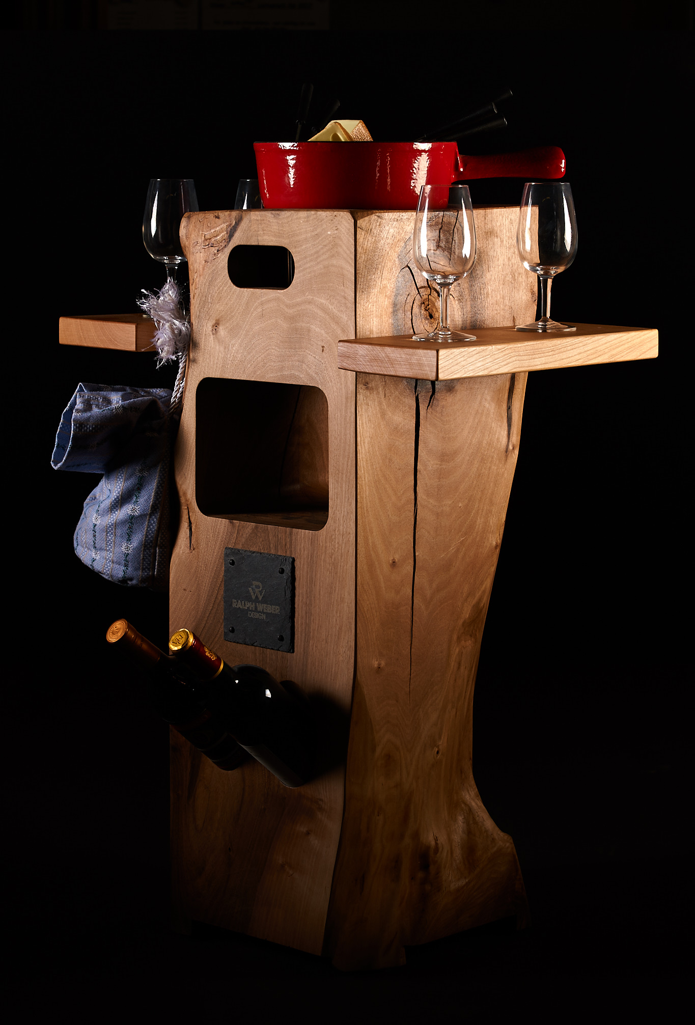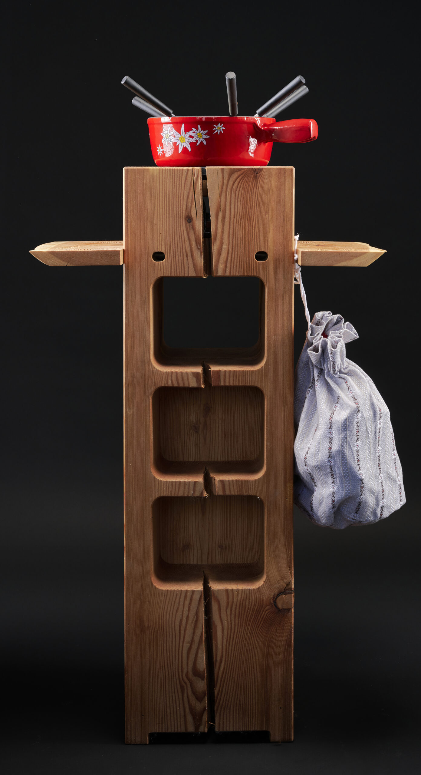 Fondue-Holzklotz “Chääs” massiv, Ausfräsung für Fonduecaquelon, 2 Ausfräsungen für Weinflaschen, 2 “Halbregale”, 1 “Regal”, auf 2 Seiten Lochbohrungen für Tablare (Tablare, Brotsack und Gläser sind im Preis nicht enthalten), Folgendes Zubehör ist im Lieferumfang enthalten: Caquelon Keramik, Rechaud inkl. Unterteller, 1 Pastenbrenner leer, 6 Käsefondue-Gabel, ist in der Holzart Bündner Lärche erhältlich HxBXT 800x280x280 mm