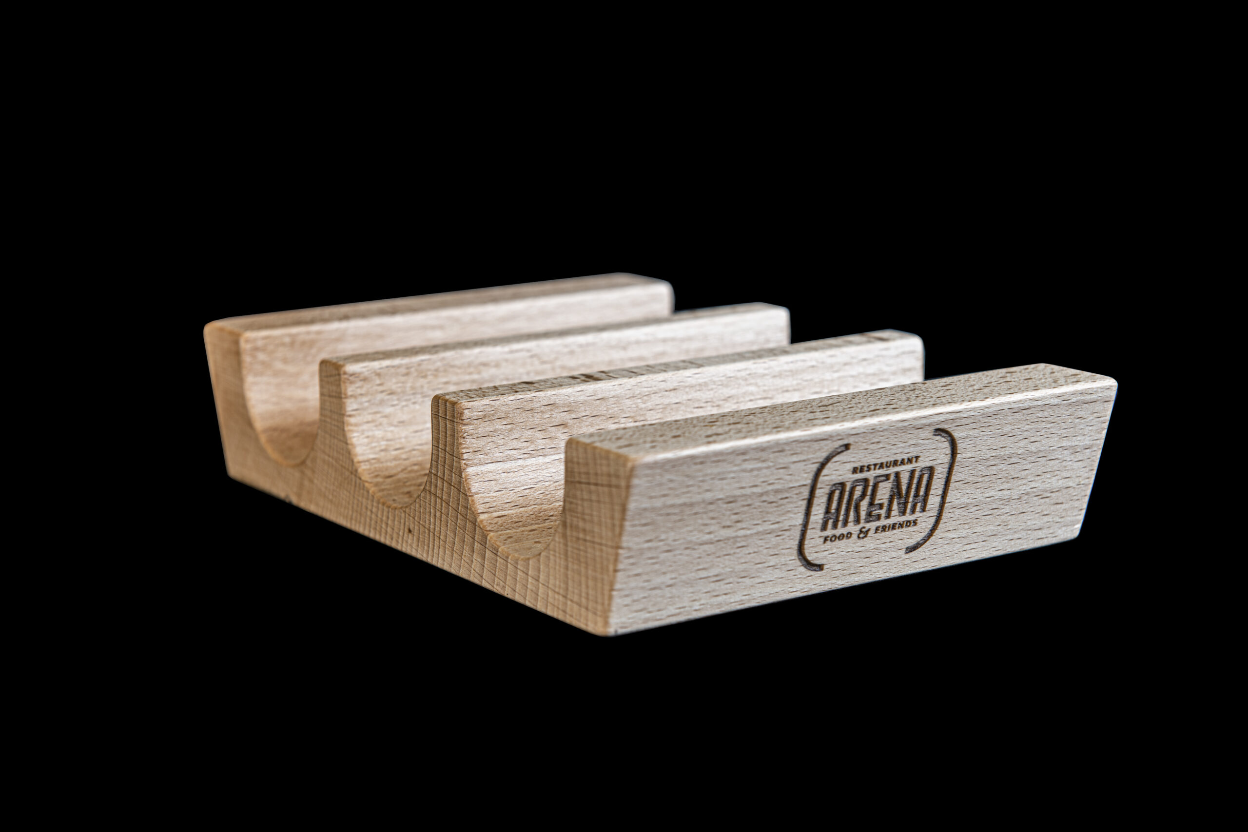 Tacobrett Buche massiv 3 Rundungen/Ausbuchtungen 4 cm breit Randbereich 2.5 cm breit und 17° angeschrägt für besseren Halt Grösse L x B x H: 19 x 13 x 4 cm